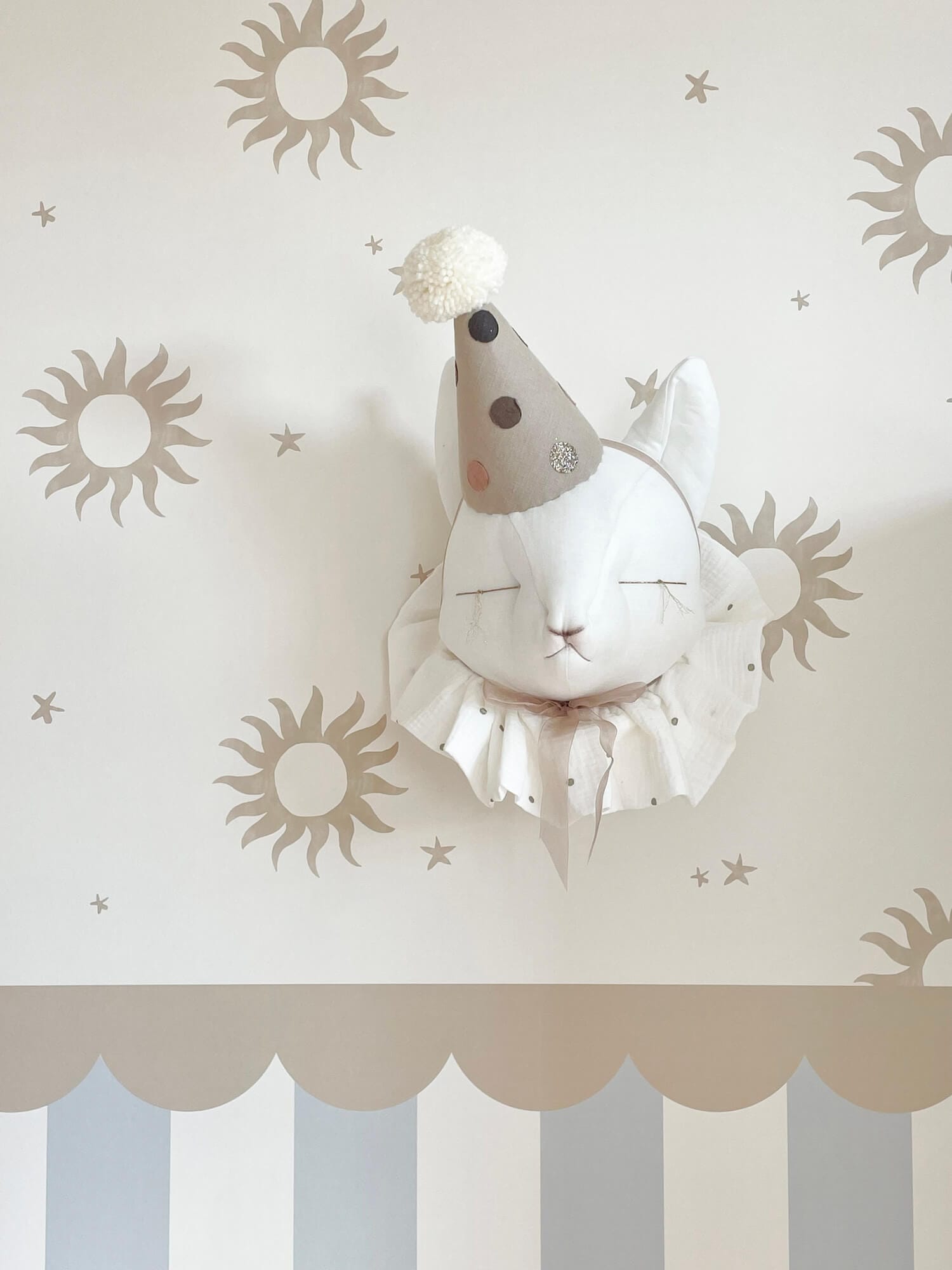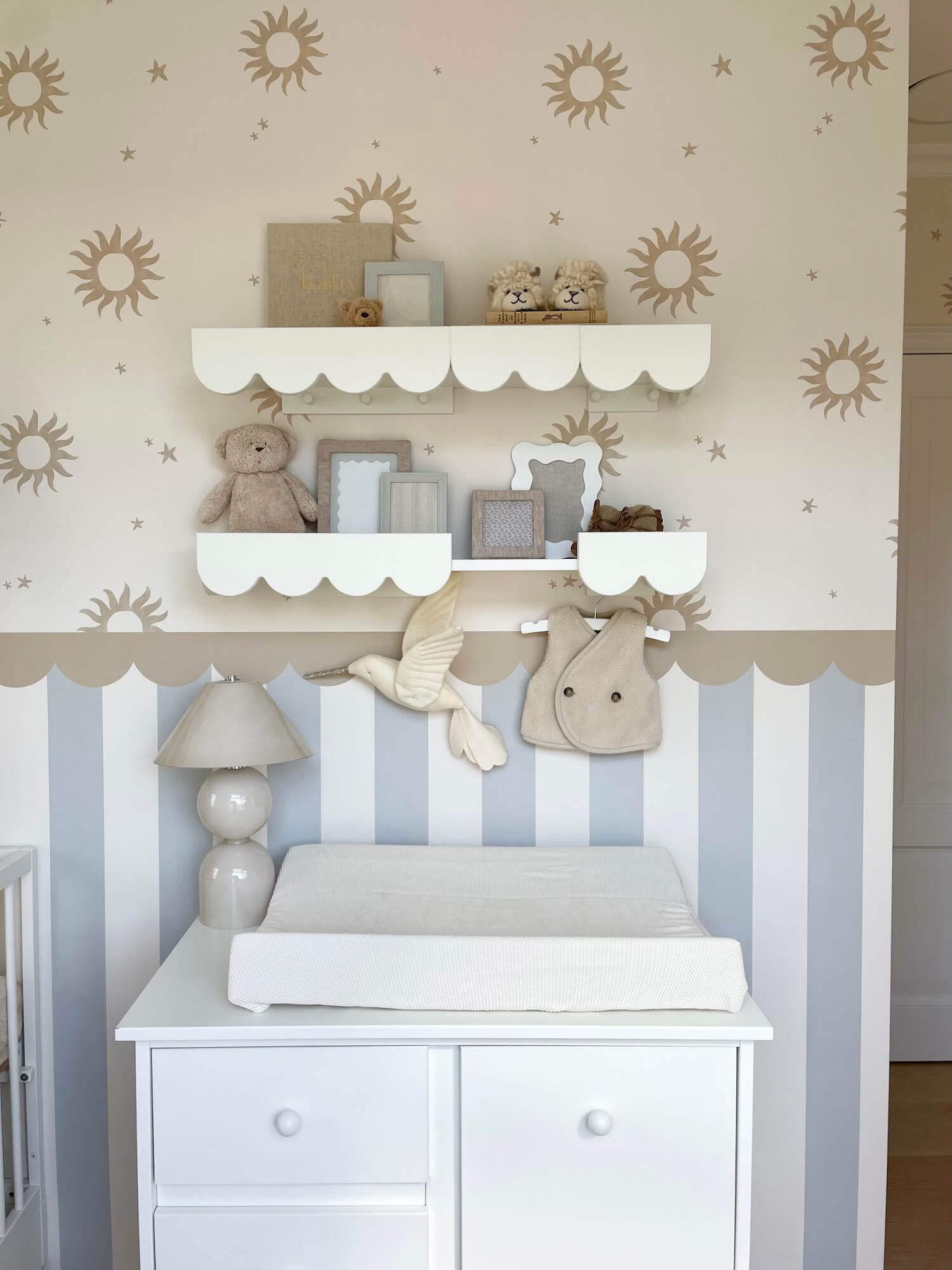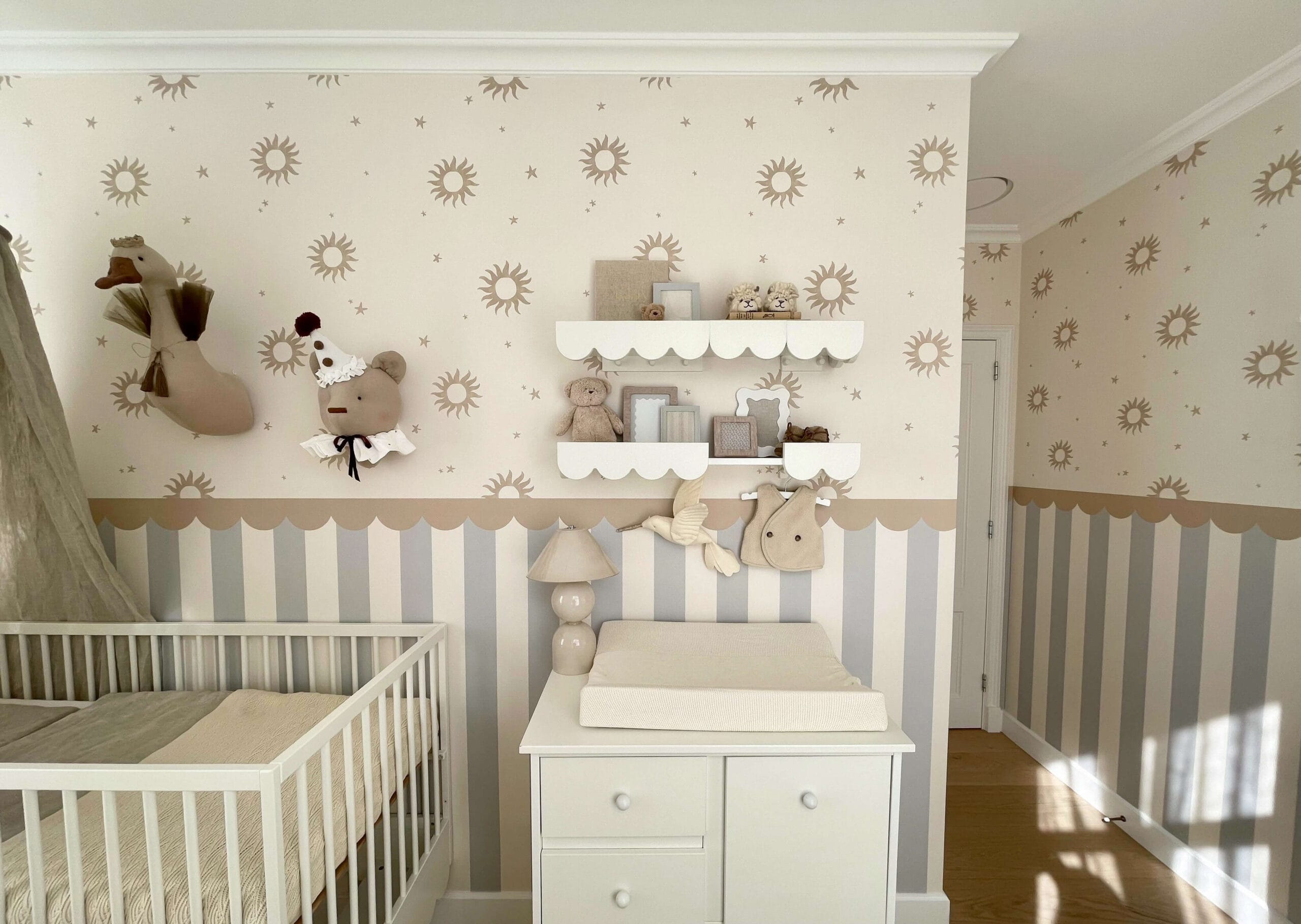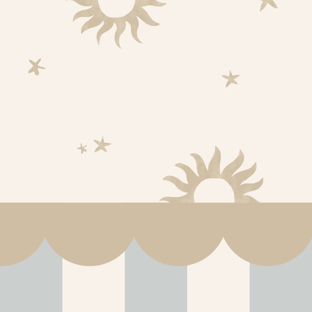 ‘Sol’ is het fantastische resultaat van een samenwerking tussen Lisa met Kae Sutherland. Speciaal ontworpen voor de babykamer van Kae’s zoontje Sol, waarnaar dit zonnige behang met schulpranden is vernoemd is verkrijgbaar in twee kleurvariaties. Voor de kamer van Sol koos Kae voor blauw (SDT0018). Er is ook een beige, genderneutrale variant (SDT0017).