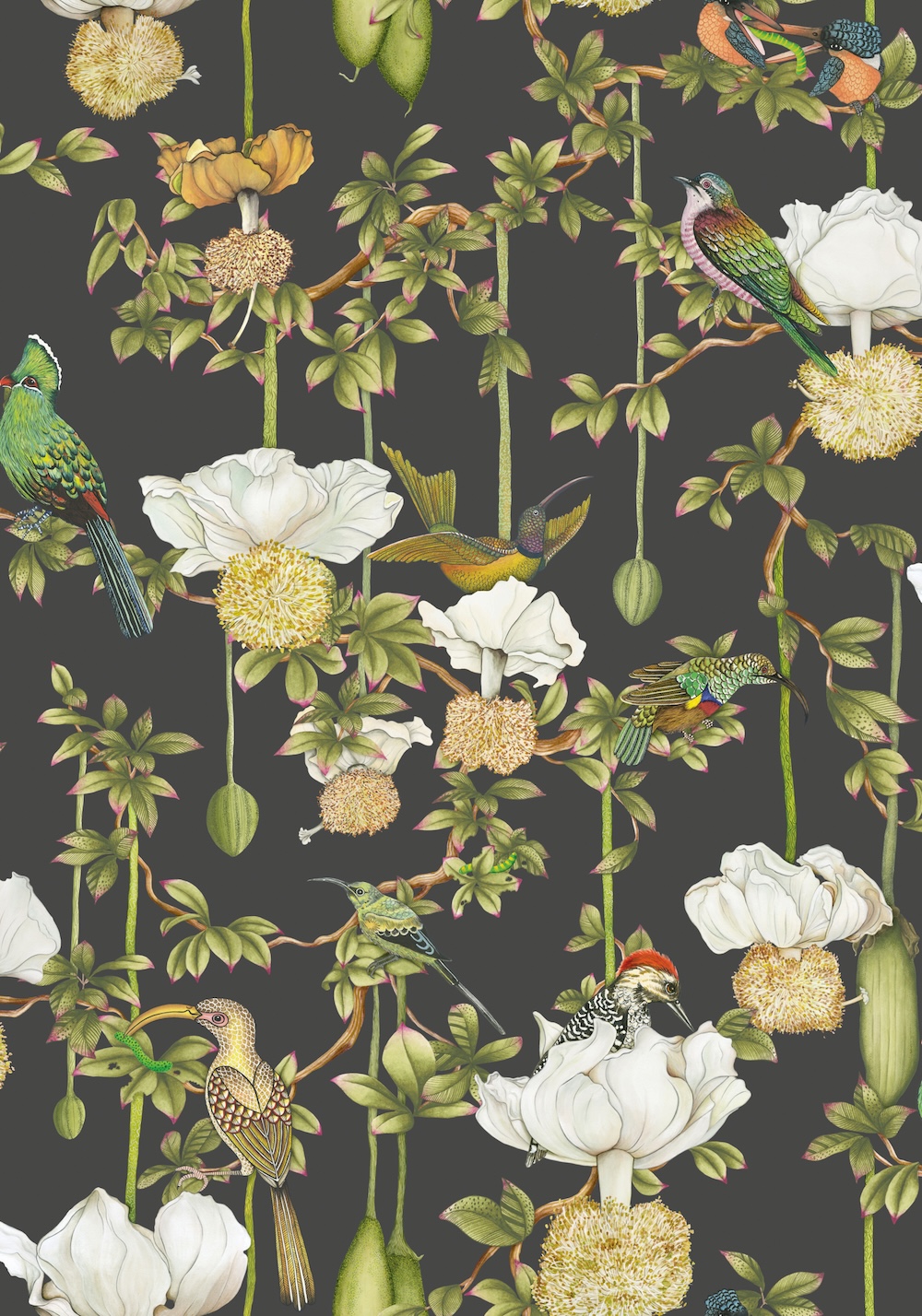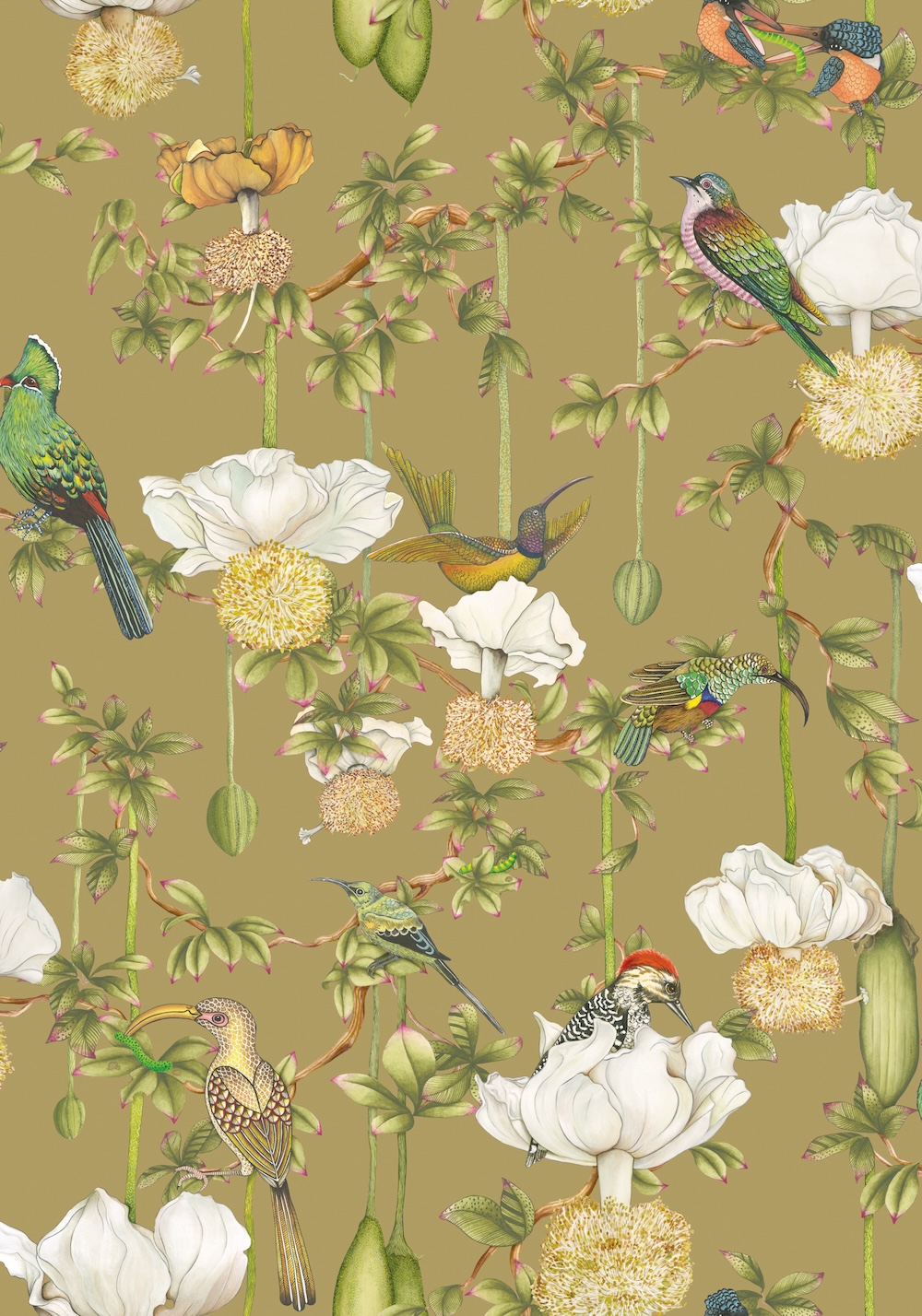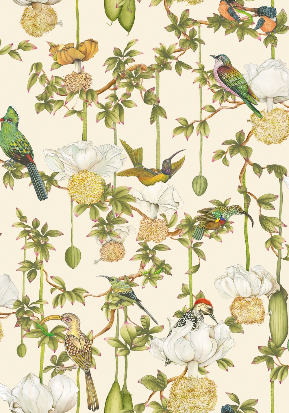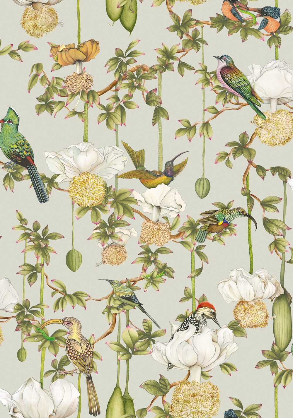Cole & Son x Ardmore – Zuid-Afrikaanse kunst in behangvorm. Het Britse Cole & Son, sinds 1875 bekend om uitzonderlijk design, kleur en vakmanschap -én een archief van meer dan 2000 blokdrukken en honderden historische patronen-, werkt voor deze collectie samen met het Zuid-Afrikaanse Ardmore, beroemd om zijn handgeschilderde keramiek vol exotische dieren en botanische motieven. Eerdere collabs van Cole & Son x Ardmore — zoals Ardmore, Jabula en het iconische Savuti — brengen Brits ambacht en Afrikaanse expressie samen in ontwerpen vol jungle vibes, rijke fauna en cultureel gelaagde details. De Baobab-collectie is één van de absolute highlights. Geïnspireerd door de Zuid-Afrikaanse ‘Tree of Life’ – de Baobap – combineert het handgeschilderde fauna, tropische symboliek en een luxueus Platinum-palet met een subtiel metallic effect. Dankzij de vezelige drager krijgt het behang een bijna handgemaakt karakter. De collectie bestaat uit negen levendige ontwerpen, elk rijk aan detail. Baobab brengt de sfeer van KwaZulu-Natal moeiteloos naar binnen: warm, wild, kleurrijk en uitgesproken.