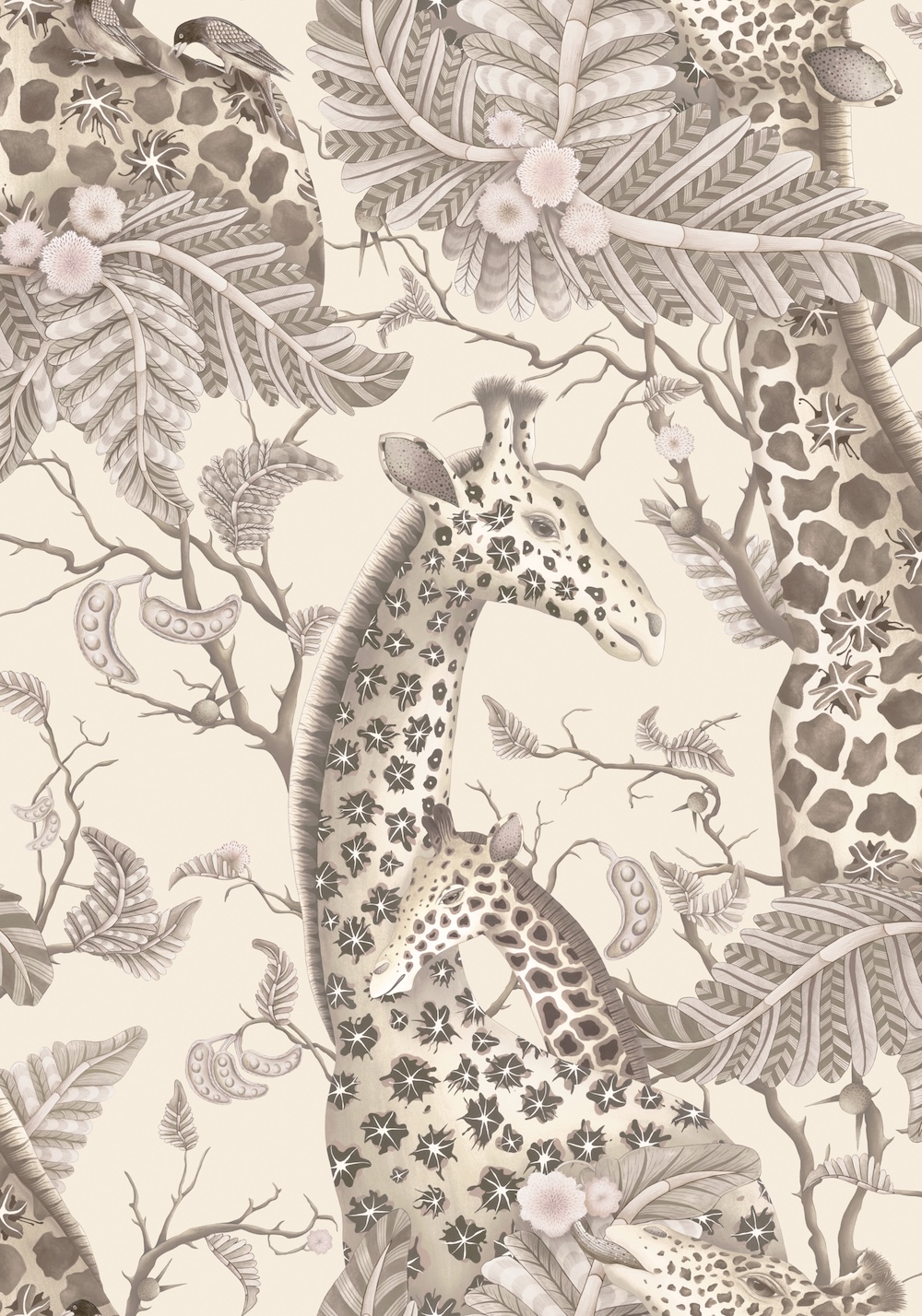 Deze Design Meets Art-collectie is een ode aan de Zuid-Afrikaanse baobab, ook wel de ‘Boom des Levens’. De iconische boom, vol symboliek en mystiek, staat voor heling, kracht en de rijke biodiversiteit van Zuid-Afrika. Royal Giraffe is een boeiend ontwerp van een moeder-giraffe en haar kalf tussen acaciabladeren en bonenpeulen. Elke giraffe is versierd met fantastische handgeschilderde details. Een echt Royal Gilded-palet geeft de scène een gouden uur-gloed, met een subtiel getextureerde basis die het licht elk detail laat versterken. Dit behang op vlies is afwasbaar en eenvoudig aan te brengen: de muur inlijmen, bij voorkeur met Arte Clearpro.