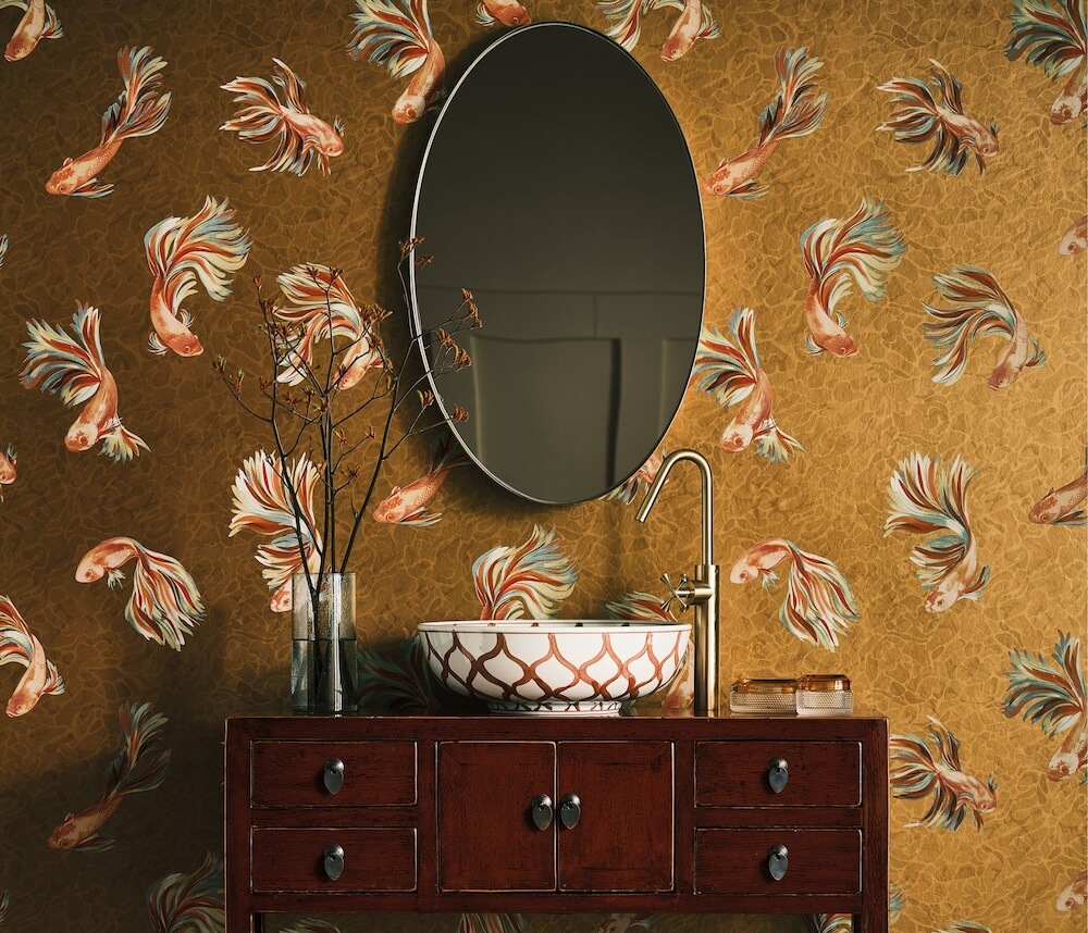 Klassiek, maar dan met een moderne twist. De Belvedere-collectie van Osborne & Little mixt statige allure met eigentijdse flair. Denk aan dessins geïnspireerd door indrukwekkende paleizen, kastelen en historische buitenhuizen, verborgen tuinen en verfijnde architectonische details. Van rijke, decoratieve patronen tot dromerige botanische prints: alles komt samen in deze prachtige, rijk gekleurde collectie. Aquaria brengt speelse lintstaart-goudvissen tot leven die soepel door het water wervelen. Het frisse, licht gespikkelde watereffect geeft het ontwerp een relaxte vibe. Dit vliesbehang is licht afwasbaar en eenvoudig aan te brengen: de muur wordt ingelijmd, bij voorkeur met Arte Clearpro. Verkrijgbaar in vier kleurstellingen, waarvan W8123-01 een metallic touch heeft.
