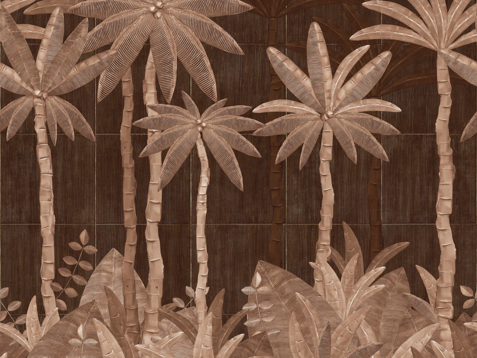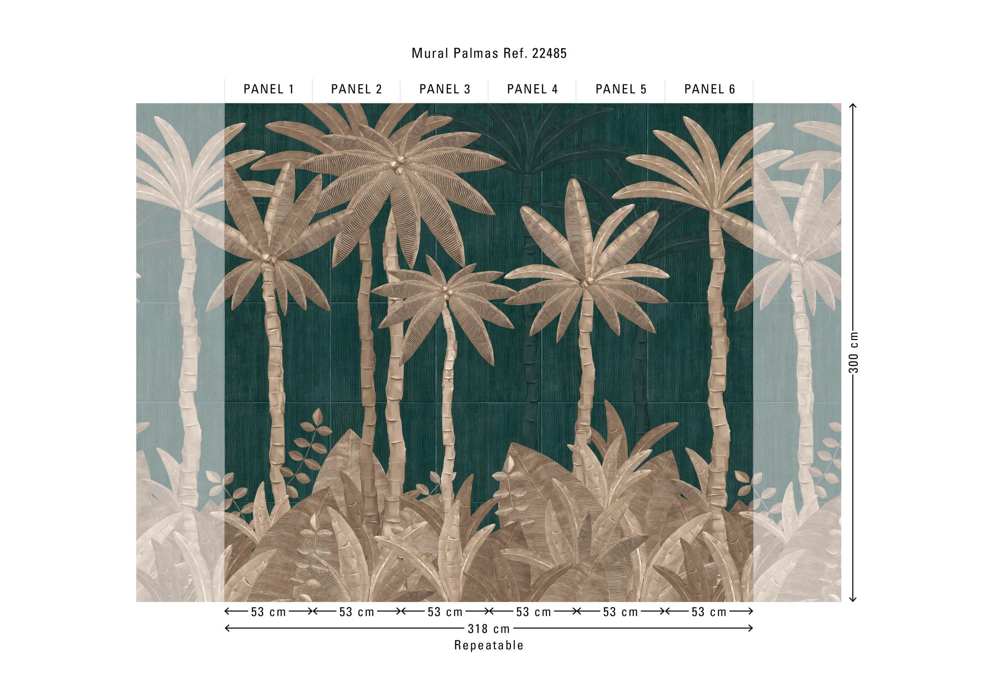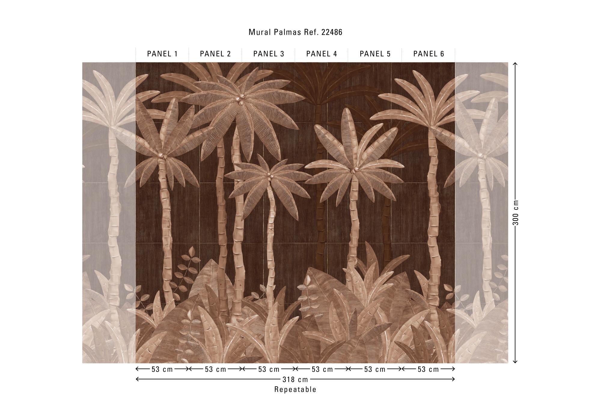 De Bossa Nova-collectie van Hooked On Walls vertaalt het Braziliaanse muziekgevoel naar grafische patronen: ritmisch, helder en met een ontspannen flow. De collectie combineert organische lijnen, tactiele structuren en moderne murals die een ruimte meteen richting geven. Palmas brengt een exotisch, botanisch paneel met gedetailleerde palmbomen en bladeren. De vormen lijken bijna driedimensionaal houtsnijwerk, waardoor het ontwerp een luxe, sculpturale diepte krijgt. De diepe bruintinten geven de wand een warme, uitnodigende sfeer en maken van Palmas een echte blikvanger. Dit vinylbehang op vlies is lichtbestendig, goed afwasbaar en eenvoudig aan te brengen: de muur inlijmen – bij voorkeur met Arte Clearpro. Bovendien is het afstripbaar, wat een vlotte verwijdering mogelijk maakt. Het paneel van 318 cm x 300 cm wordt geleverd op één rol van zes stroken van 53 cm breed. De tekening sluit perfect aan zodat je meerdere exemplaren naast elkaar kunt plaatsen. Verkrijgbaar in twee kleurstellingen.