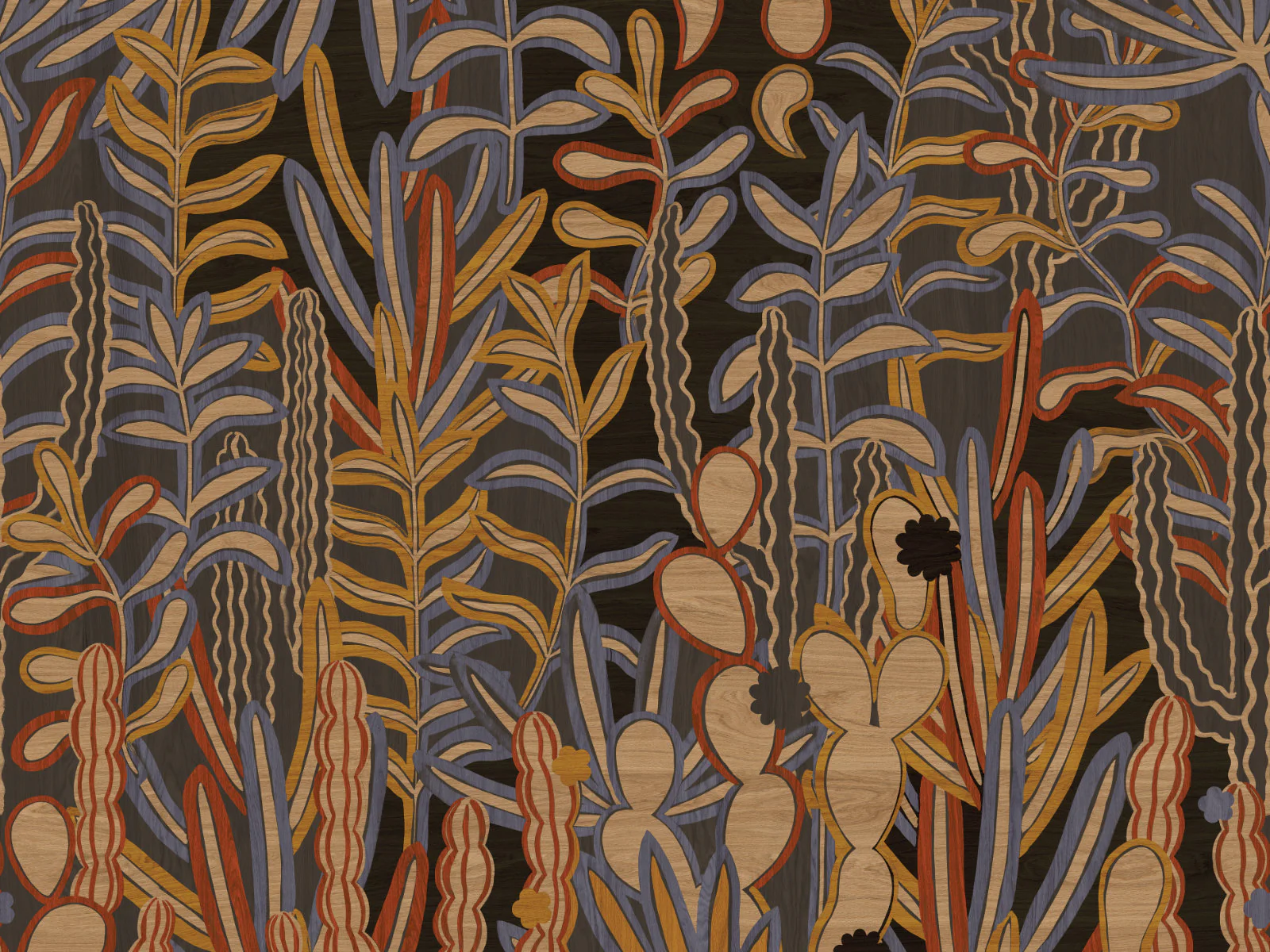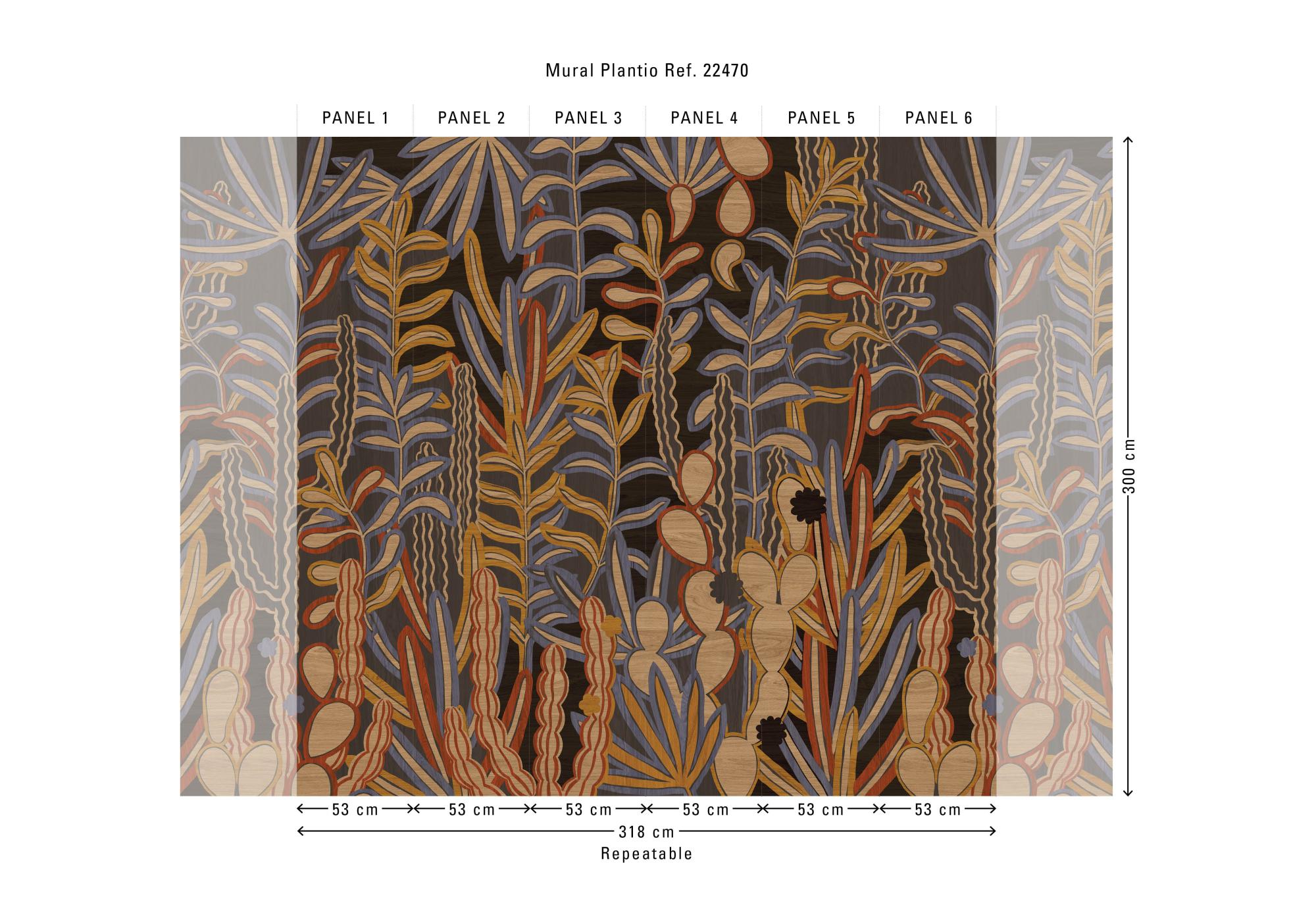 De Bossa Nova-collectie van Hooked On Walls vertaalt het Braziliaanse muziekgevoel naar grafische patronen: ritmisch, helder en met een ontspannen flow. De collectie combineert organische lijnen, tactiele structuren en moderne murals die een ruimte meteen richting geven. Plantio is een uitgesproken botanisch paneel met cactussen en bladeren. De vormen zijn opgebouwd als een soort houten inlegwerk, waardoor het dessin een rijke, gelaagde uitstraling krijgt. Het diepe kleurpalet — aardse tinten op een donkere achtergrond — maakt het geheel warm, modern en sfeervol. Dit vinylbehang op vlies is lichtbestendig, goed afwasbaar en eenvoudig aan te brengen: de muur inlijmen – bij voorkeur met Arte Clearpro. Bovendien is het afstripbaar, wat een vlotte verwijdering mogelijk maakt. Het paneel van 318 cm x 300 cm wordt geleverd op één rol van zes stroken van 53 cm breed. De tekening sluit perfect aan zodat je meerdere exemplaren naast elkaar kunt plaatsen.