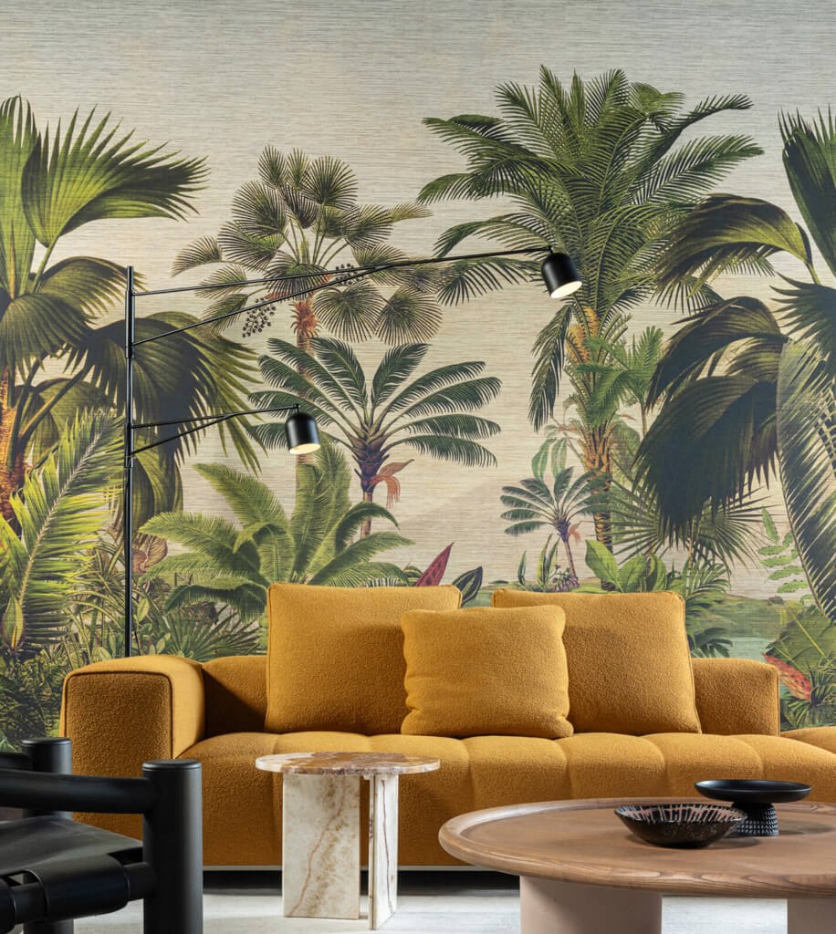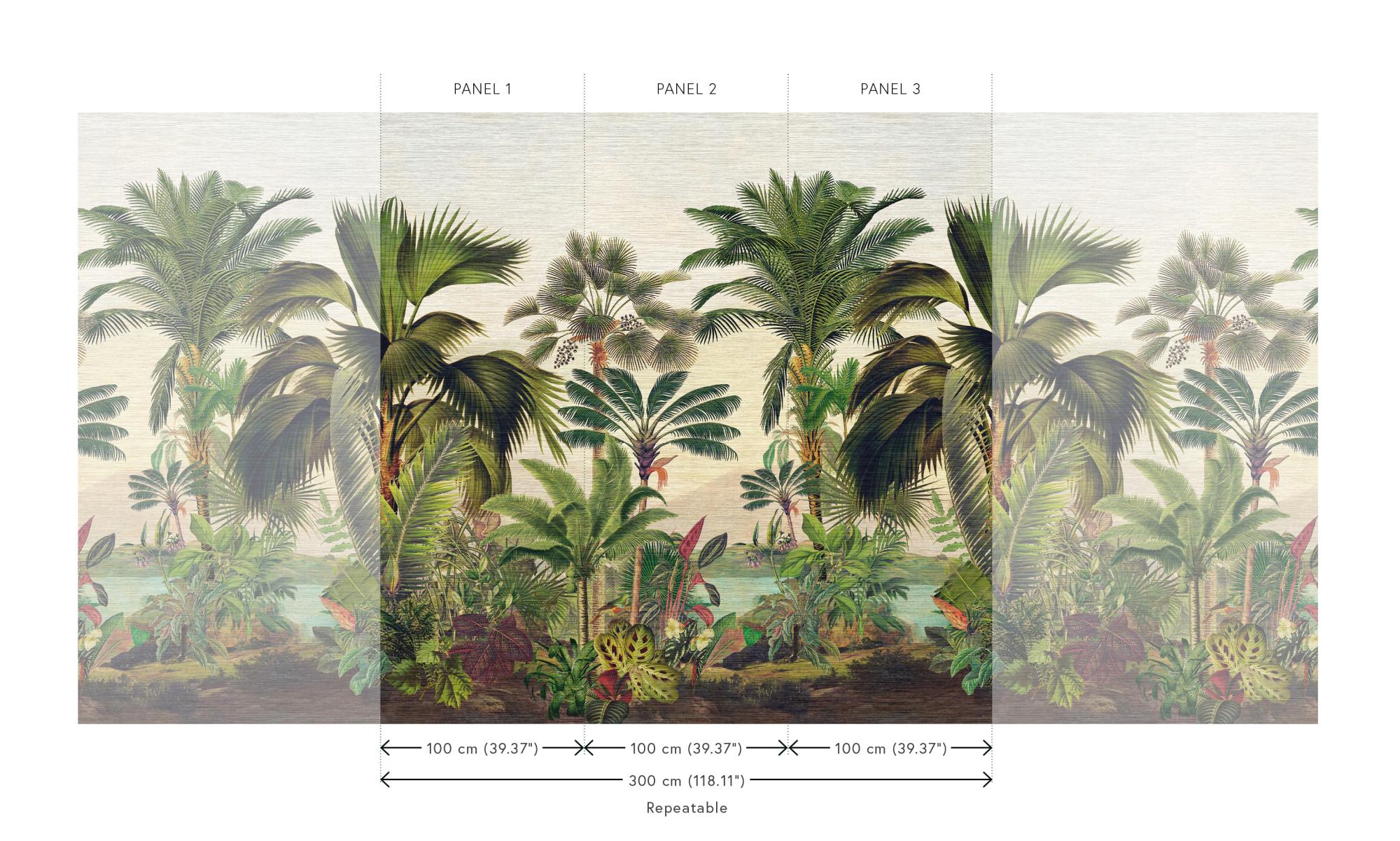 De Décors & Panoramiques-collectie van Arte is een bijzondere lijn muurdecoraties die kunst en interieur samenbrengt. Elk panorama of décor vertelt een eigen visueel verhaal, versterkt door verrassende materialen — van fluweelzachte zijdelooks en bouclé tot verfijnde linnenstructuren. De handgeschilderde Panoramiques vormen samen één indrukwekkend panoramisch kunstwerk, opgebouwd uit meerdere banen. De Décors zijn echte statement pieces: uitgesproken afbeeldingen die per meter worden geleverd. Rêverie Tropicale uit deze collectie is een dromerig panorama dat je midden in een weelderige oase plaatst. Tussen het bladwerk ontdek je steeds nieuwe details, terwijl in de achtergrond een subtiele bedrukking van geweven gras zichtbaar wordt. Die structuur geeft niet alleen het dessin, maar ook het materiaal zelf een natuurlijke uitstraling. Een rustig, tropisch decor met een zachte textuurlaag. Deze muurbekleding op vlies is goed lichtbestendig, licht afwasbaar en eenvoudig aan te brengen: de muur wordt ingelijmd, bij voorkeur met Arte Clear pro-lijm. Bovendien is het afstripbaar, wat een vlotte verwijdering mogelijk maakt. Het panorama van 300 cm x 300 cm wordt geleverd op één rol van vijf stroken van 100 cm breed. De tekening sluit perfect aan zodat je meerdere exemplaren naast elkaar kunt plaatsen. Verkrijgbaar in twee kleurstellingen.