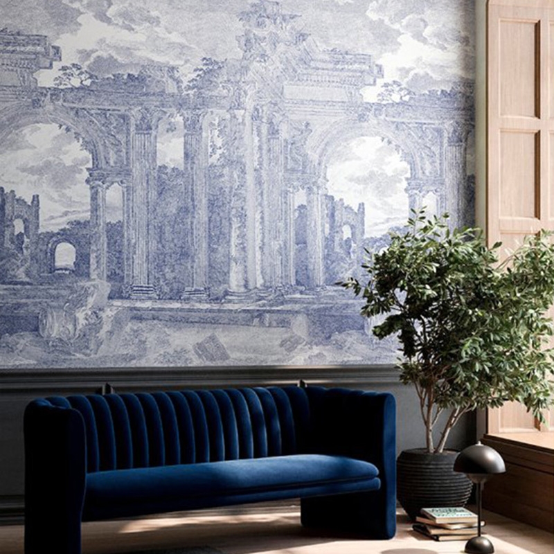 De Décors & Panoramiques-collectie van Arte is een bijzondere lijn muurdecoraties die kunst en interieur samenbrengt. Elk panorama of décor vertelt een eigen visueel verhaal, versterkt door verrassende materialen — van fluweelzachte zijdelooks en bouclé tot verfijnde linnenstructuren. De handgeschilderde Panoramiques vormen samen één indrukwekkend panoramisch kunstwerk, opgebouwd uit meerdere banen. De Décors zijn echte statement pieces: uitgesproken afbeeldingen die per meter worden geleverd. Rovine uit deze collectie is een statig vinylpanorama dat een ets van een Griekse ruïne nabootst. De tekening toont de oudheid in verval en is gebaseerd op een werk van Monsieur Descamps, schilder aan het Franse hof. Een grafisch, klassiek decor met een rustige, monumentale uitstraling. Deze vinylmuurbekleding op vlies is goed lichtbestendig, afwasbaar en eenvoudig aan te brengen: de muur wordt ingelijmd, bij voorkeur met Arte Clear pro-lijm. Bovendien is het afstripbaar, wat een vlotte verwijdering mogelijk maakt. Het panorama van 200 cm x 300 cm wordt geleverd op één rol van twee stroken van 100 cm breed. De tekening sluit perfect aan zodat je meerdere exemplaren naast elkaar kunt plaatsen. Verkrijgbaar in twee kleurstellingen.