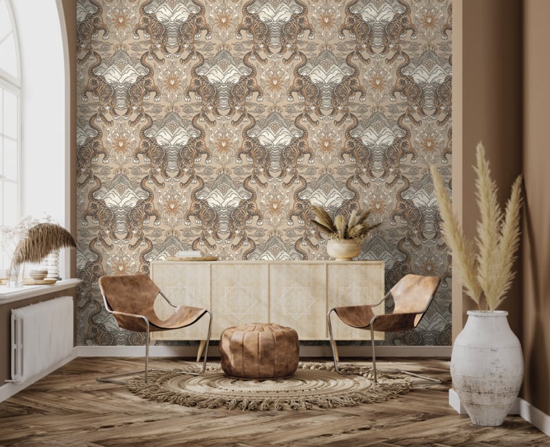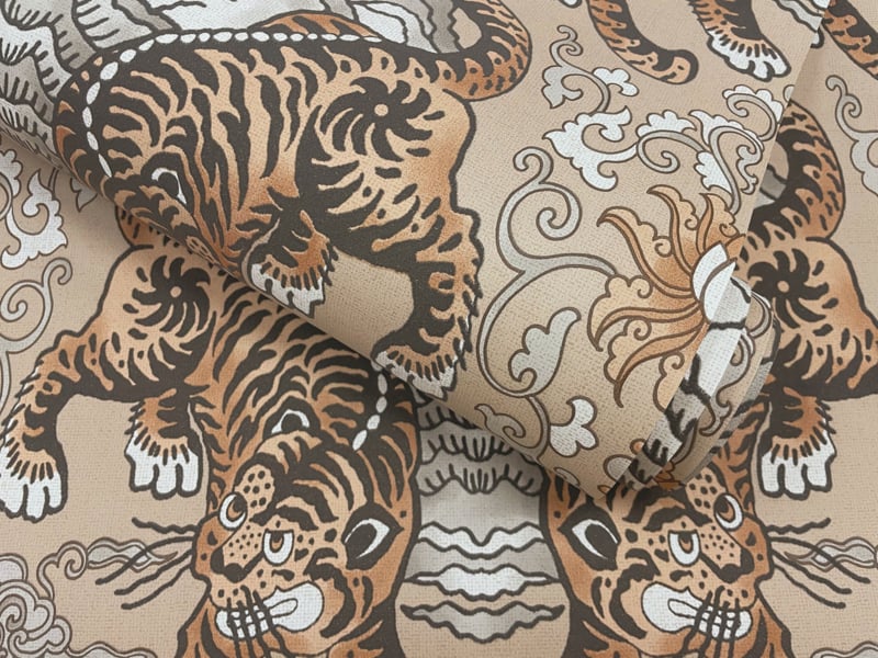 Een luxe behangcollectie geïnspireerd op Chinese cultuur en mythologie. Het dessin draait om een krachtige tijger — hét symbool voor moed en kracht — omlijst door sierlijke scrollpatronen en gestileerde berglandschappen. Rijke details en sprankelende texturen geven het geheel een verfijnde, almost-magische uitstraling.