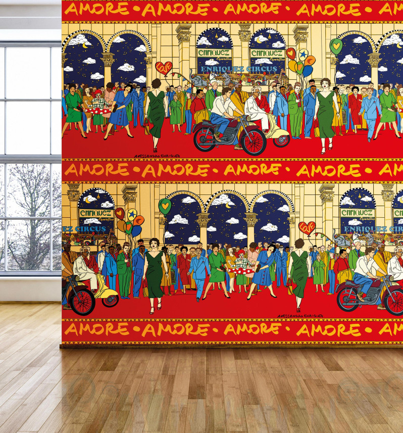 Milano behang uit de Enriquezland-collectie van Hooked On Walls is een liefdesbetuiging van de ontwerper aan de stad Milaan en zijn elegant geklede bewoners. Het dessin heeft een panoramische afmeting van 272 cm (4 x 68 cm) x 300 cm. De Enriquezland-collectie is ontstaan uit een samenwerking van Janelli & Volpi en ontwerper Alessandro Enriquez is een ode aan Italië. Intense kleuren, levendige kenmerken en vol symbolen van liefde. Een selectie van 50 tekeningen, ondertekend door de ontwerper, die een heel specifieke boodschap overbrengen: Liefde!