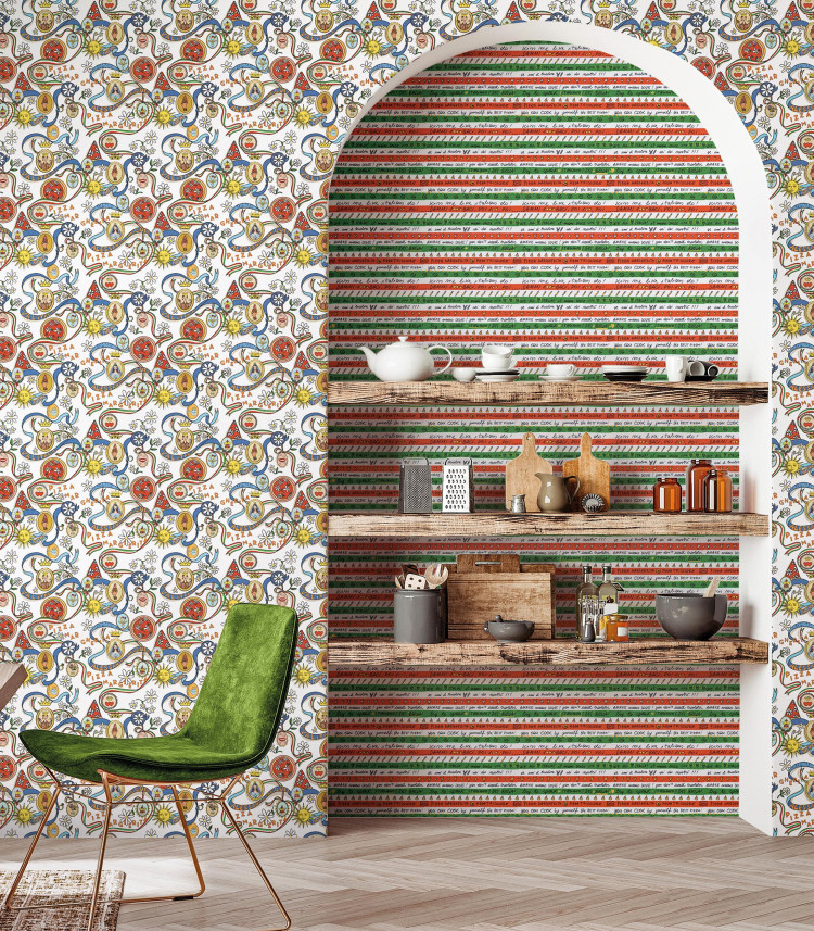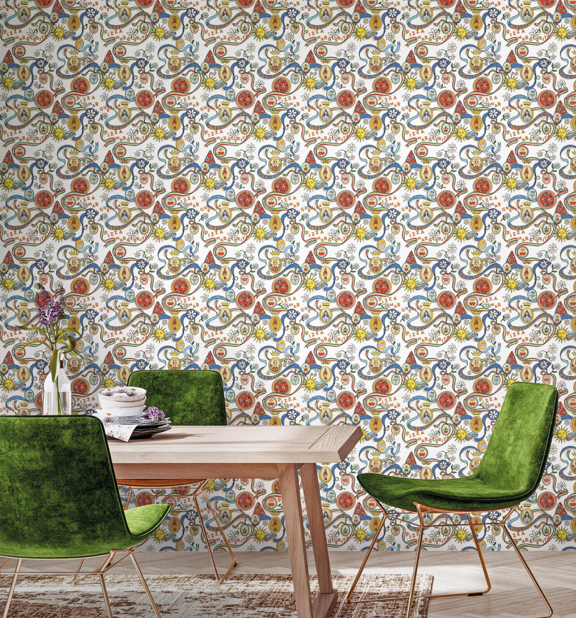 Pizza Margherita behang uit de Enriquezland-collectie van Hooked On Walls is één en al Italië wat de klok slaat, met een hoofdrol voor de wereldberoemde Pizza Margherita, heeft een patroon van 34 centimeter. De Enriquezland-collectie is ontstaan uit een samenwerking van Janelli & Volpi en ontwerper Alessandro Enriquez is een ode aan Italië. Intense kleuren, levendige kenmerken en vol symbolen van liefde. Een selectie van 50 tekeningen, ondertekend door de ontwerper, die een heel specifieke boodschap overbrengen: Liefde!