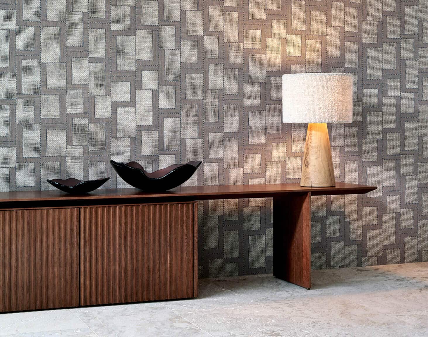 Een sterke vezel gemaakt van twee verschillende grassoorten. In geweven vorm wordt hij gebruikt voor allerlei ambachtelijk vervaardigde decoraties en gebruiksobjecten. Zo vormde hij de inspiratie voor dit dessin waarbij de strakke vormen mooi contrasteren met het willekeurig ogende patroon.