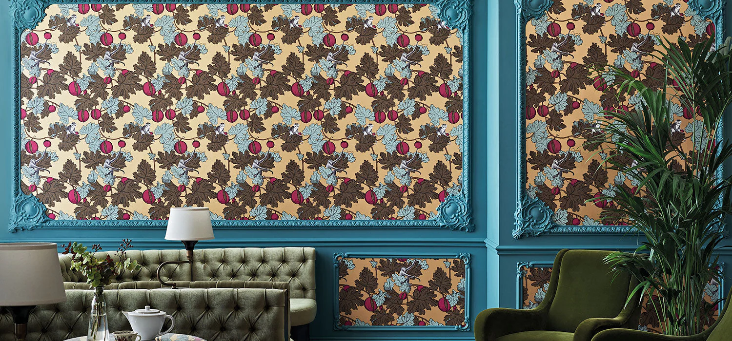 Frutto Proibito combineert op glorieuze wijze verschillende archiefmotieven van Fornasetti uit de jaren veertig en vijftig. Ondeugende apen die oorspronkelijk werden ontworpen als opvallende houtpanelen voor de Milanese patisserie Dulciora, zitten tussen uitgestrekte takken van granaatappelbomen. De speelse compositie van flora en fauna is typisch Fornasetti en is een mix van levensechte tekeningen en gedurfde prints.