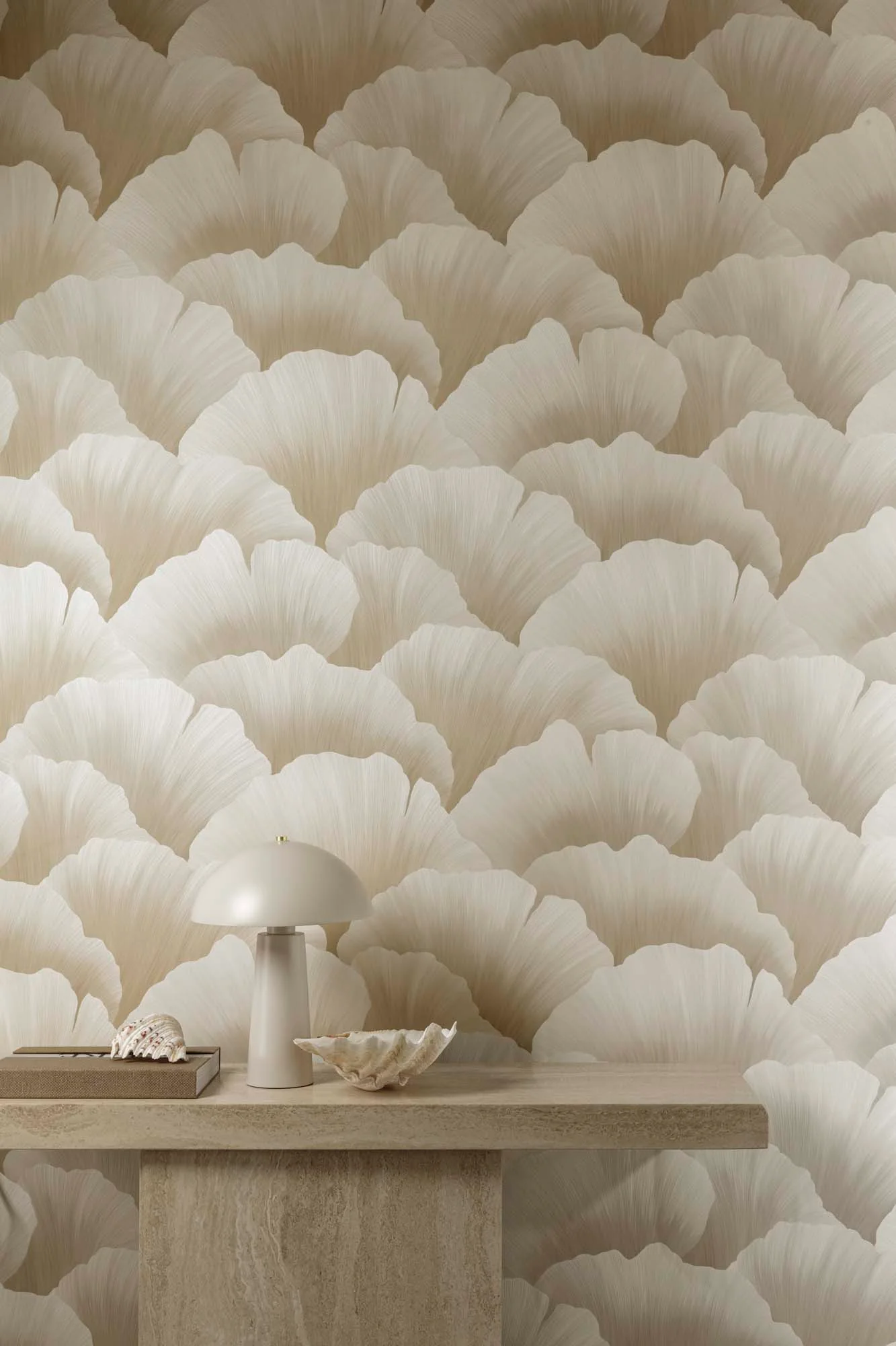 Laat je meevoeren door de serene schoonheid van Ginkgo, een dessin dat symbool staat voor rust, balans en eeuwige gratie. De fijn vormgegeven bladeren van de ginkgoboom waaieren subtiel over de wand, alsof ze zachtjes meebewegen met een zomerbries. De combinatie van natuurlijke vormen en verfijnde glans zorgt voor een luxueuze uitstraling die moeiteloos past in zowel een modern als klassiek interieur.