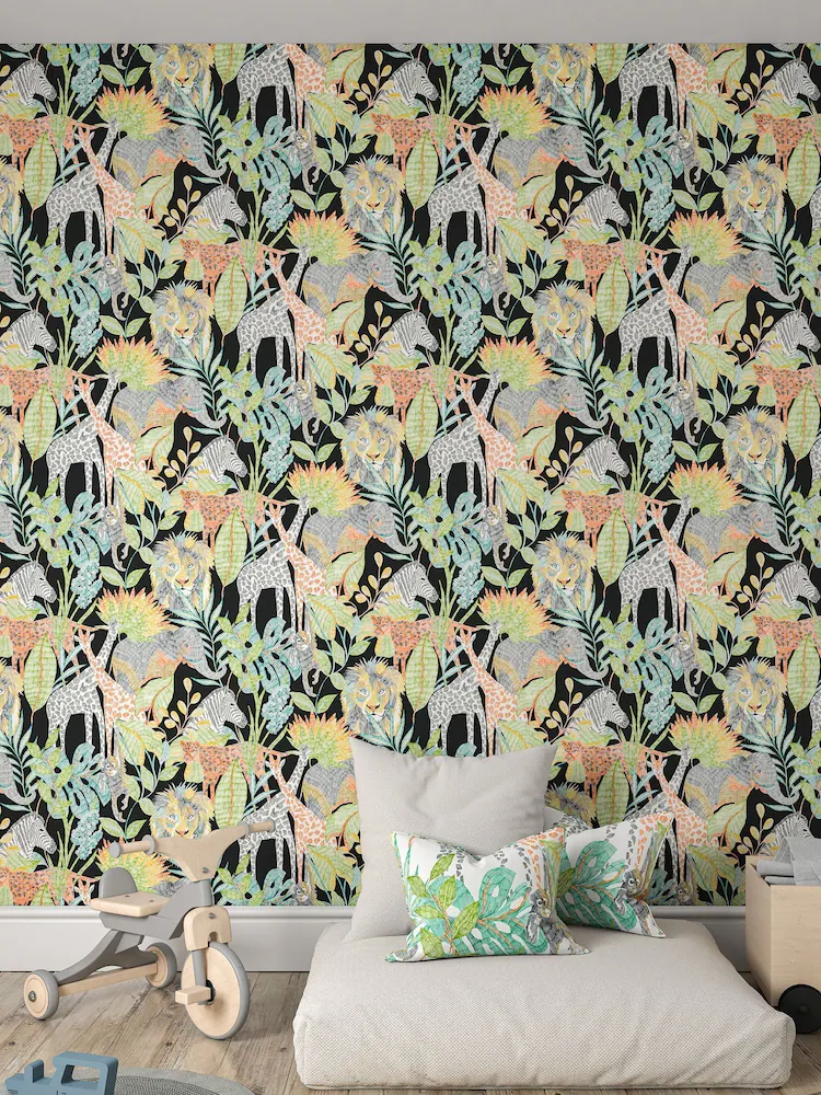Reis door deze middernachtelijke jungle van acaciabladeren en hoge bomen op zoek naar vriendelijke giraffen, trotse leeuwen, gestreepte zebra’s en majestueuze olifanten.n Met de hand getekend met viltstift, dit op schoolbord geïnspireerde ontwerp is werkelijk verbluffend.