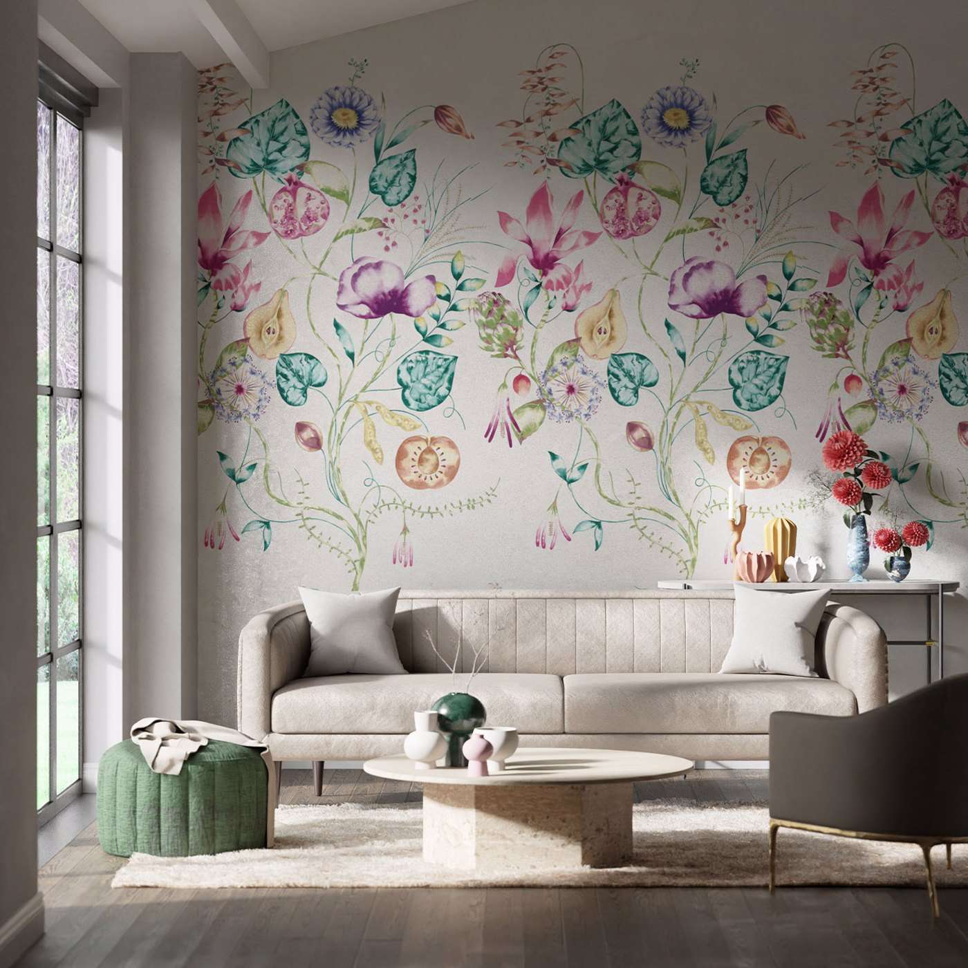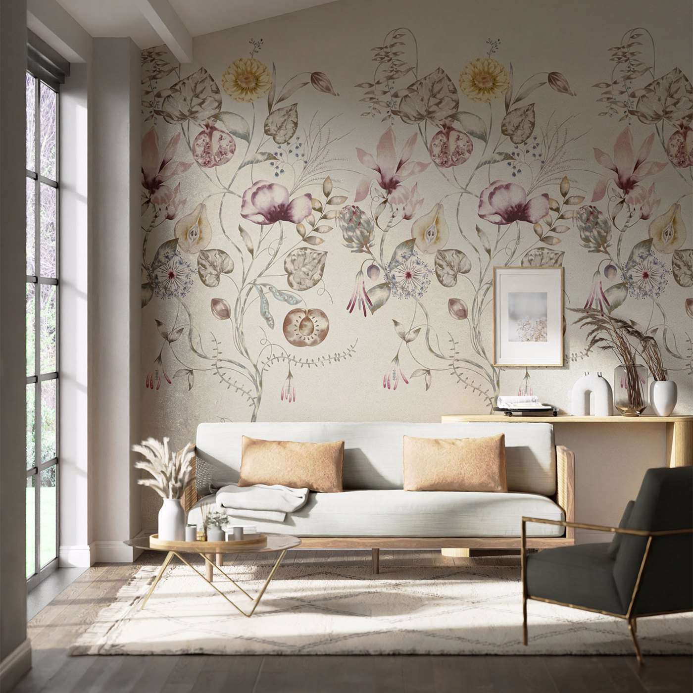 Maak een statement met dit weelderige behangpaneel met een kamerhoge boeket van losjes verstrengelde zaadkoppen, artisjokken, vijgen, granaatappels en ander exotisch fruit.