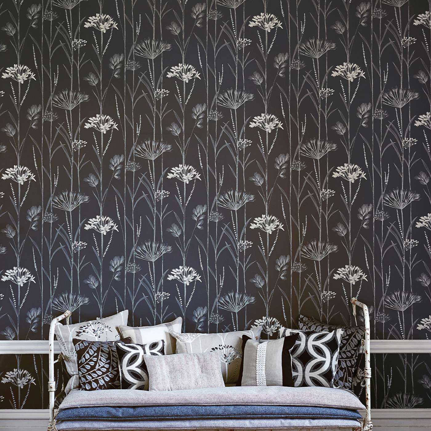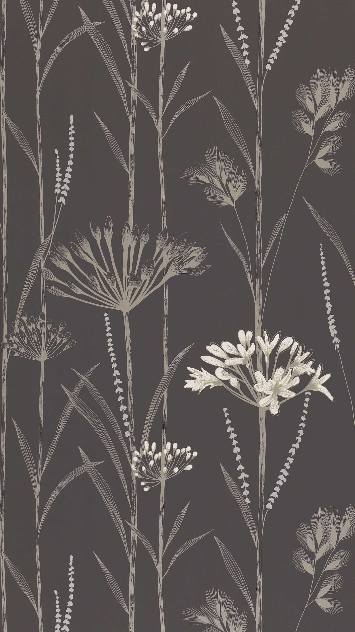 Een elegant hangend behangontwerp van zaadkoppen met lange stelen en grassen met metalen hints op een effen achtergrond. n Gebruik om muren groter te laten lijken in kleinere ruimtes of over grote muurvlakken om in het oog te springen.