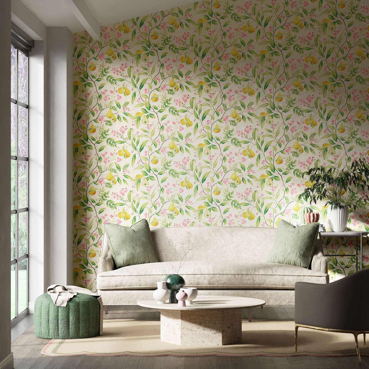 Vrouwelijk en zweverig, Diane’s liefde voor botanische schilderkunst komt tot uiting in dit zachte, zachte ontwerp. Vernoemd naar Marie Curie, sappige peren en slepende wijnstokken, geaccentueerd met delicate bloesems, creëren een zeer Engels gevoel.