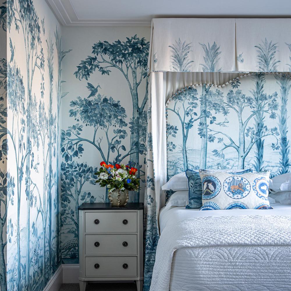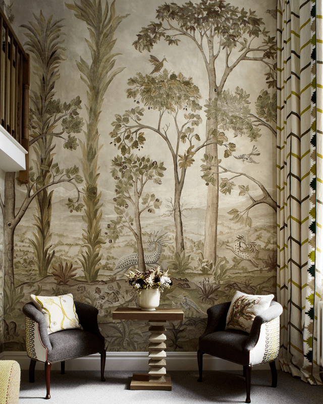 Tall Trees’ van Kit Kemp is een grote muurschildering in zachte tinten van een boslandschap met konijnen, vogels, boshyacinten en mythische wezens tussen hoge eiken en paardenkastanjebomen. Deze muurschildering wordt geleverd als A-, B- en C-panelen op één rol. Elk paneel meet 70 cm (B) x 300 cm (H). De totale muurschildering is 210 cm (B) x 300 cm (H). Het is herhaalbaar.