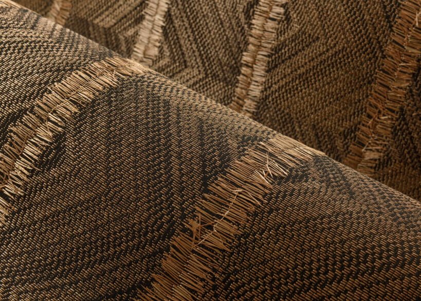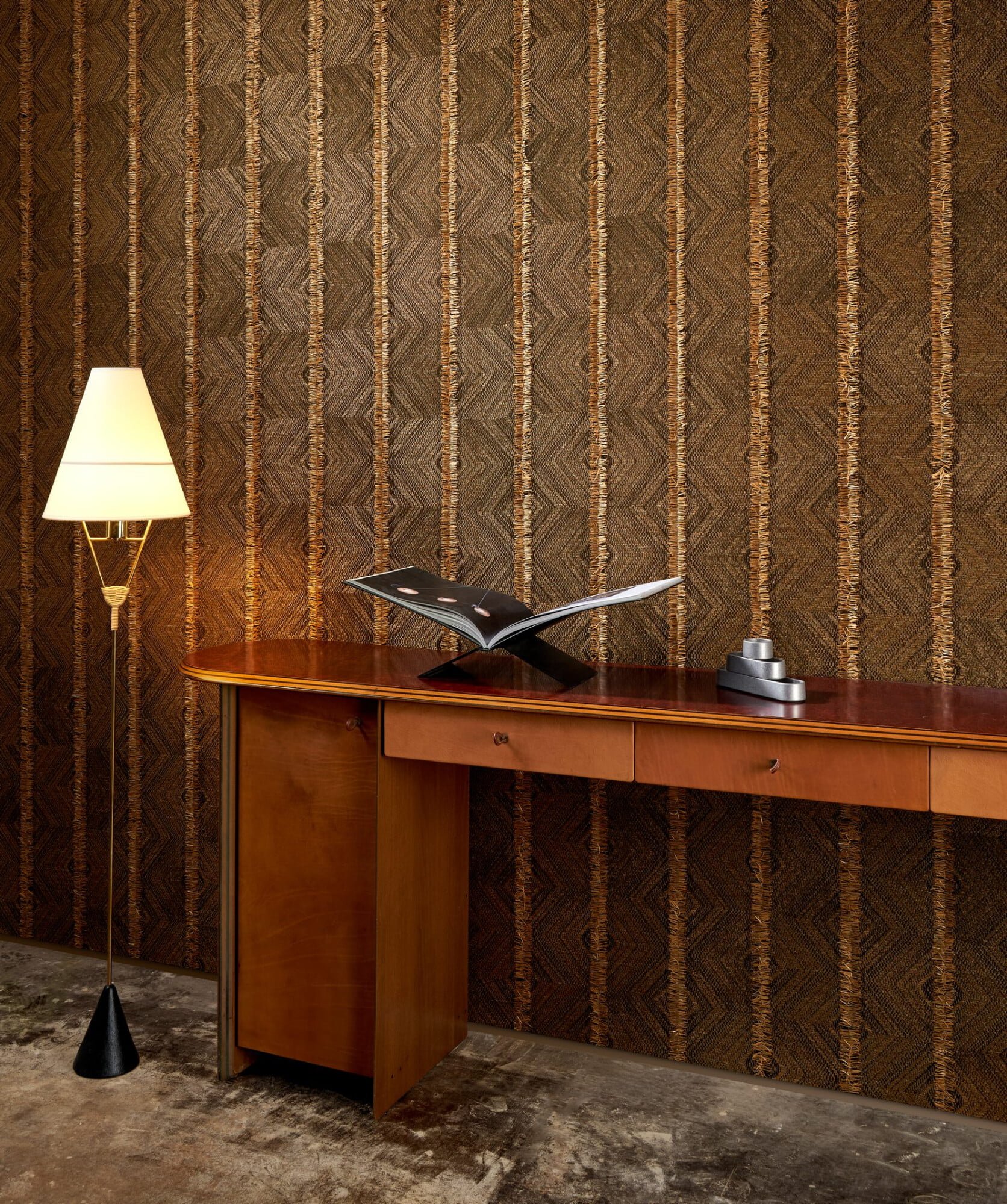 Een verbluffend dessin, gemaakt volgens de jacquard-techniek waarbij het strakke blokkenpatroon in de weving van de stof verwerkt zit. De losse draadjes creëren zonder meer een spectaculair effect aan de muur.