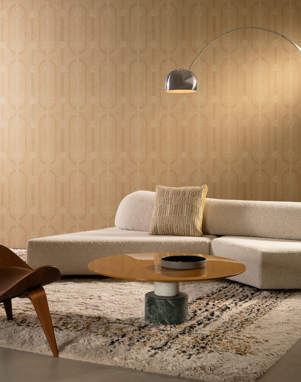 De Essentials Luxor-collectie van Arte brengt de glamour van de roaring twenties tot leven. Geometrische dessins met een Art Deco-twist, verrijkt met invloeden uit het oude Egypte. Ingelegde grasweefsels, vertaald naar verfijnde prints met innovatieve druktechnieken. Amulet vertaalt de luxe van Art Deco-sieraden naar een modern wanddessin. Repeterende geometrische lijnen geven het ontwerp een grafische, tijdloze uitstraling. Dit vliesbehang is goed lichtbestendig, licht afwasbaar en eenvoudig aan te brengen: de muur wordt ingesmeerd, bij voorkeur met Arte Clearpro lijm. Verkrijgbaar in zeven verschillende warme kleuren.