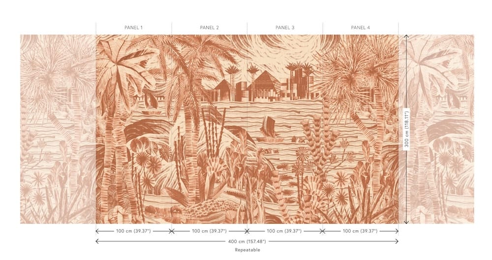 De Essentials Luxor-collectie van Arte brengt de glamour van de roaring twenties tot leven. Geometrische dessins met een Art Deco-twist, verrijkt met invloeden uit het oude Egypte. Ingelegde grasweefsels, vertaald naar verfijnde prints met innovatieve druktechnieken. Thebe uit deze collectie showt een panoramisch decor met palmen, piramiden en de Nijl als centraal thema. Fijne details van bloemen en dieren zorgen voor extra diepte in het ontwerp. De fil-à-fil geweven jute versterkt de textuur en geeft het wandbeeld een krachtige, materiële uitstraling. Dit natuurbehang op vlies is goed lichtbestendig, tijdens het plaatsen zeer licht afwasbaar en eenvoudig aan te brengen: de muur wordt ingesmeerd, bij voorkeur met Arte Clearpro lijm. Het paneel van 400 cm x 300 cm wordt geleverd op één rol van vier stroken van 100 cm breed. De tekening sluit perfect aan zodat je meerdere exemplaren naast elkaar kunt plaatsen. Verkrijgbaar in twee kleurvariaties.