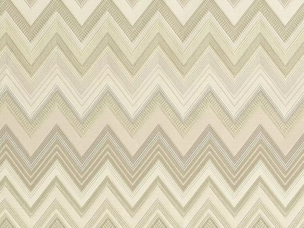 Geeft het maxi-chevronpatroon een emotionele twist. Door gebruik van hot-embossing krijgt de oppervlakte rijke reliëfaccenten, terwijl de kleurovergang van zachtgroen naar lila naar okergoud – of het ingetogen blauw-grijze ton sur ton – een fluïde spel van pastel tot tint geeft. De stijgende of fluisterende schakeringen lijken te dansen, zoals een geweven patchwork dat ritmisch over de muur beweegt.
