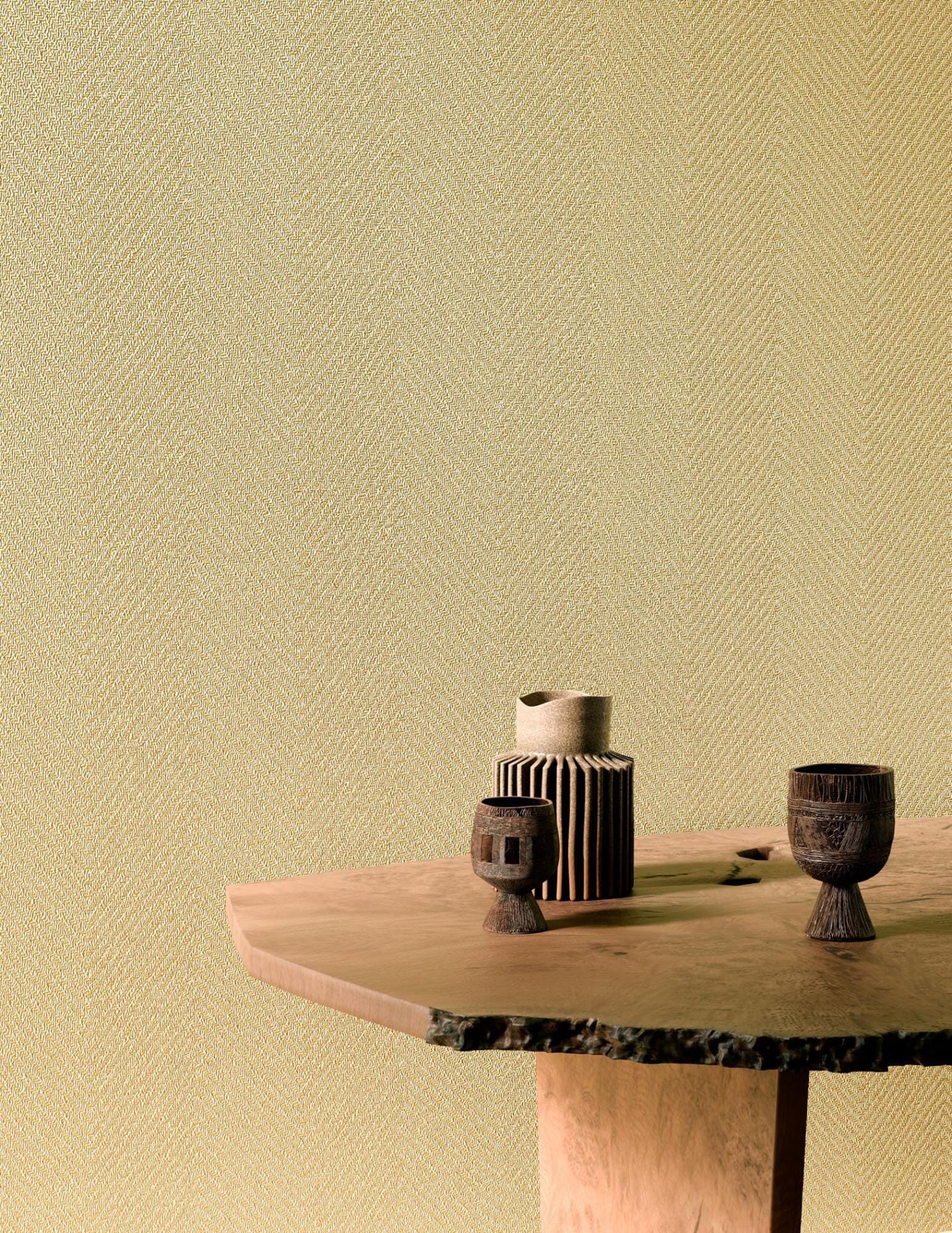 Een elegant chevronpatroon – visgraat in het Frans – van papier en jute met een subtiel bohemien tintje. Atuona eert het eilanddorp waar Gauguin en Brel hun laatste hoofdstuk schreven. Deze natuurmuurbekleding op vlies is gemiddeld lichtbestendig, tijdens het plaatsen licht afwasbaar en eenvoudig aan te brengen: de muur inlijmen – bij voorkeur Arte Clearpro – en de rug van het behang bevochtigen om de lijm te activeren, waardoor het behang perfect hecht aan de muur. Bovendien is het afstripbaar, wat een vlotte verwijdering mogelijk maakt. Verkrijgbaar in vijf verschillende warme tinten.