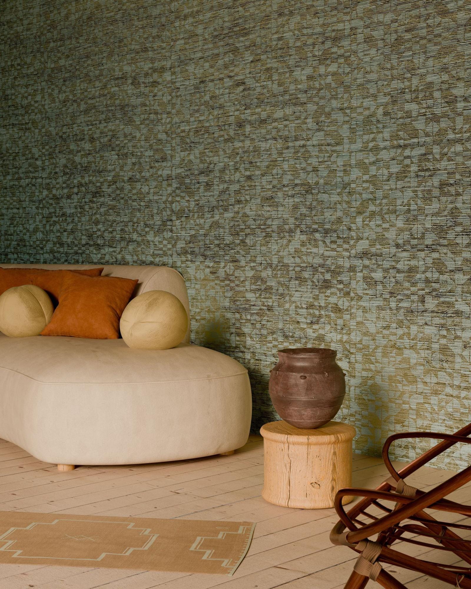 Het Cyperus dessin uit de Marquesa-collectie van Arte laat een geometrisch patroon zien, zorgvuldig geprint op natuurlijk gras en afgewerkt met een subtiele metaaltint. Cyperus ontleent zijn naam aan een inheemse grassoort van de Marquesaseilanden. Deze natuurmuurbekleding op vlies is gemiddeld lichtbestendig, tijdens het plaatsen licht afwasbaar en eenvoudig aan te brengen: de muur inlijmen – bij voorkeur Arte Clearpro – en de rug van het behang bevochtigen om de lijm te activeren, waardoor het behang perfect hecht aan de muur. Bovendien is het afstripbaar, wat een vlotte verwijdering mogelijk maakt. Verkrijgbaar in vijf verschillende warme tinten.