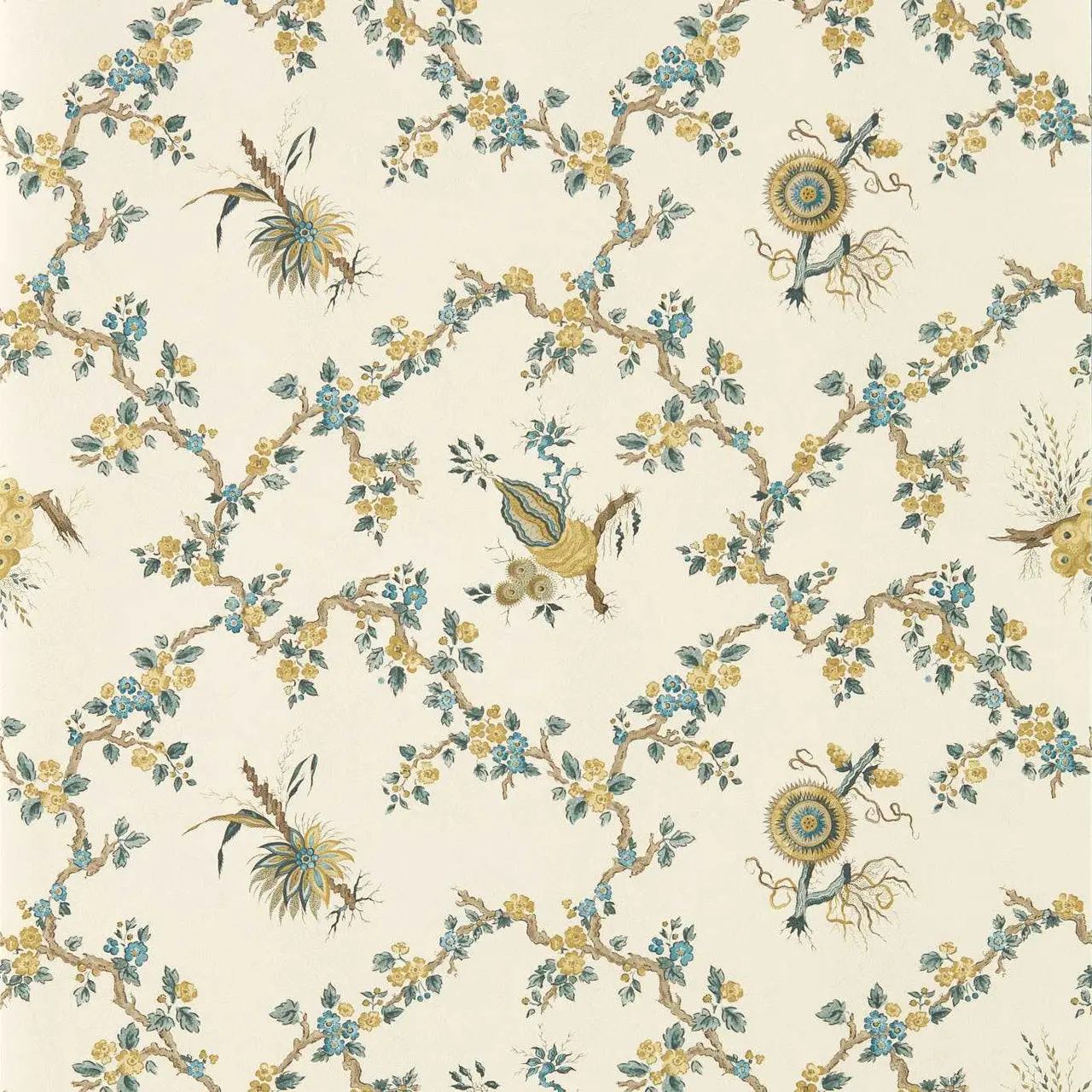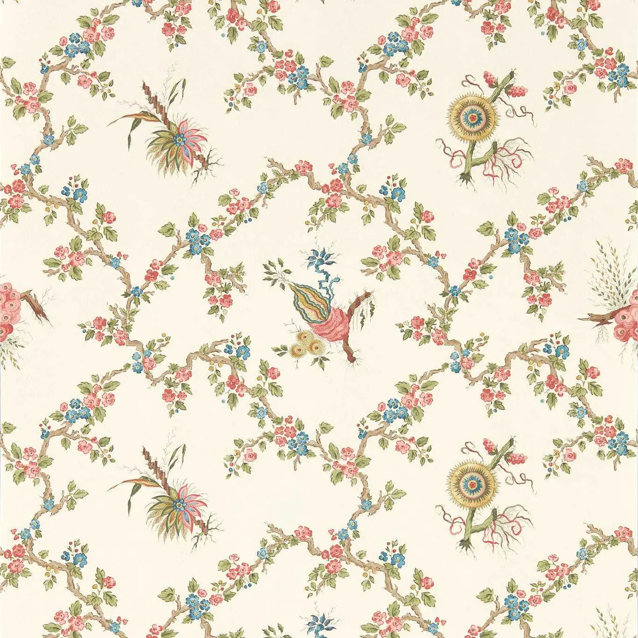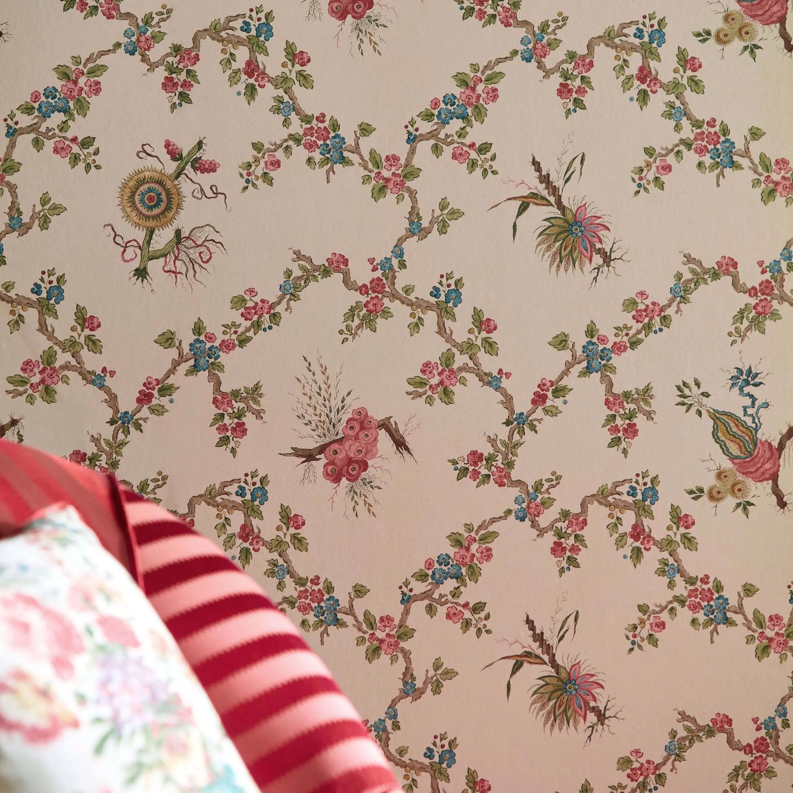 Giles Deacon is een Britse couturier en illustrator, bekend om zijn theatrale stijl en gedurfde prints. Voor Sanderson dook hij in het historische archief van het merk, waaruit een speelse en eigentijdse collectie ontstond die zijn modehandtekening combineert met Sandersons rijke erfgoed. Trelliage uit de Sanderson x Giles Deacon-collectie combineert twee negentiende‑eeuwse archiefpatronen tot één elegant ontwerp. De basis is een klassiek trellis-patroon met golvende takken en bloemen. Daaroverheen zijn fijn gedetailleerde Victoriaanse botanische illustraties verweven, waardoor het geheel een rijk, bijna historisch karakter krijgt. Het resultaat is precies wat Giles Deacon “hergecontextualiseerd classicisme” noemt: een frisse, moderne blik op de fascinatie van de Victorianen voor natuur, flora en fauna. Dit vliesbehang is afwasbaar en eenvoudig aan te brengen: de muur inlijmen, bij voorkeur met Arte Clearpro. Verkrijgbaar in vier kleurstellingen.