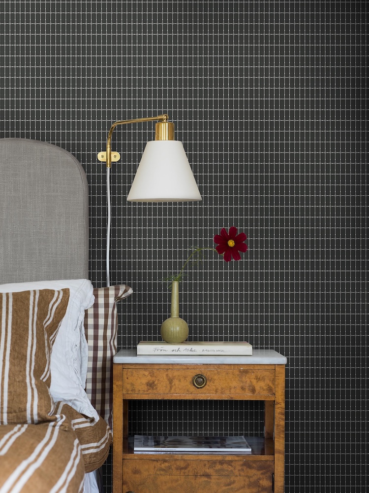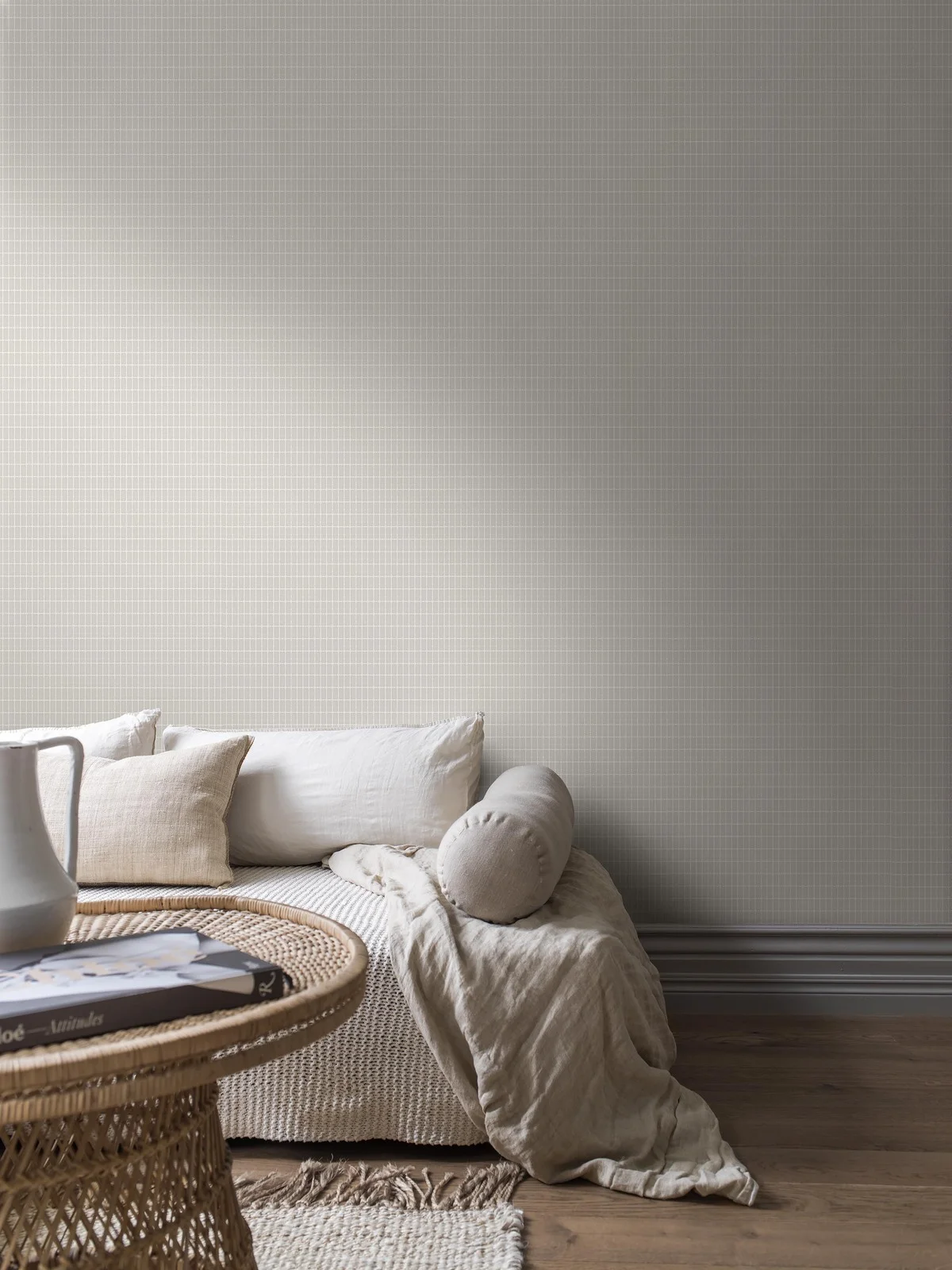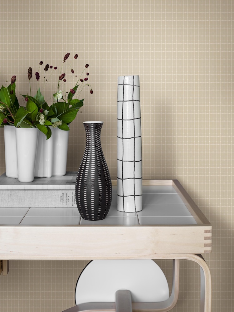 Eén van de ontwerpers in deze collectie is Alvar Aalto, één van de bekendste Finse architecten en ontwerpers van de 20e eeuw. Hij stond bekend om zijn warme, organische stijl en zijn visie dat design altijd in harmonie moet zijn met mens en natuur. Zijn werk — van architectuur tot meubels en patronen — heeft een enorme invloed gehad op het moderne Scandinavische design. Het M.I.T.-dessin straalt pure eenvoud en verfijning uit. Het subtiele geometrische patroon werd in de jaren veertig ontworpen en is gebaseerd op de bakstenen gevel van één van Aalto’s beroemde gebouwen.
