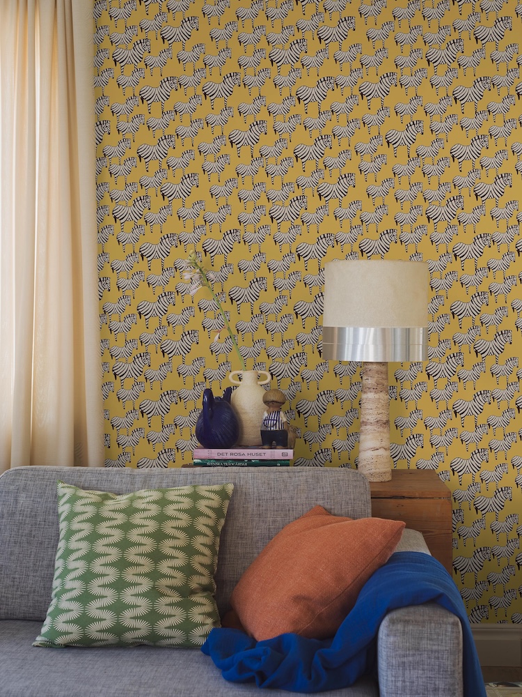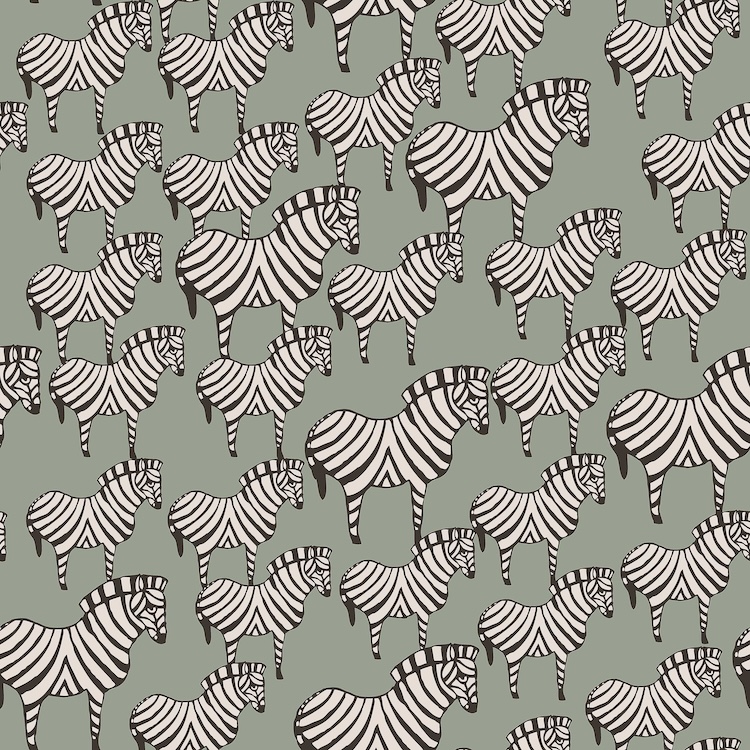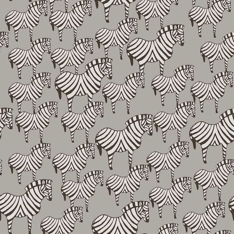 Het Zebra-dessin van Lisa Larson toont een kudde zwart-witte zebra’s tegen een zacht gele, groene of grijze achtergrond, waardoor het patroon levendig maar toch rustig oogt. Het ontwerp is gebaseerd op Larsons geliefde keramische zebra uit de beroemde Stora Zoo-serie die zij tussen 1957 en 1965 ontwierp voor de porseleinfabriek van Gustavsberg. Het behoudt met zijn mildere kleurenpalet de charmante, grafische uitstraling van het origineel. Lisa Larson (1931–2024) was een van de bekendste Zweedse keramisten en ontwerpers. Haar dierfiguren voor Gustavsberg groeiden uit tot echte designiconen en zijn vandaag de dag geliefde verzamelobjecten.