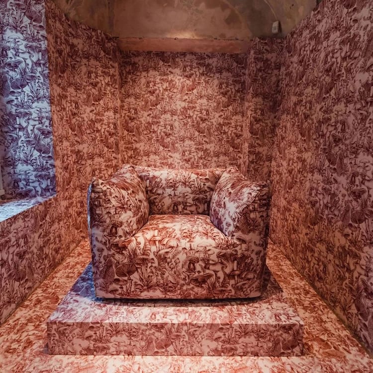 Het Fungi Forest behang van Stella McCartney x Cole & Son toont een Toile de Jouy-achtig dessin van verschillende soorten paddenstoelen die je in een bos kunt vinden. Toile de Jouy is een luxe stof voor decoraties en kleding en is bedrukt met bloem- en/of romantische motieven, zoals landschappen. De naam komt uit het Frans en betekent zoveel als ‘de stof uit Jouy’. Daarmee wordt de plaats Jouy-en-Josas bedoeld waar de stof in de 18e eeuw werd geproduceerd. Gelanceerd op Salone del Mobile 2022, vormde het Fungi Forest dessin het decor voor Stella McCartney’s Future of Fashion-tentoonstelling. Verkrijgbaar in twee kleurstellingen: Burgundy 112/1001 en Navy 122/1002