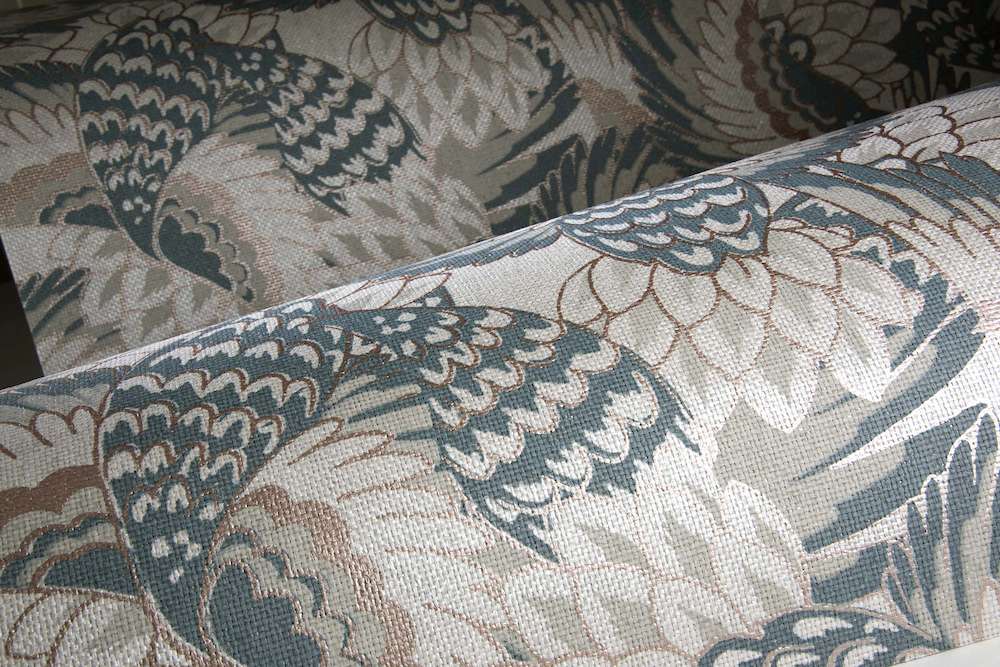 Dit patroon doet denken aan tropische vogels die kriskras door elkaar vliegen. Het geweven papier waarop het dessin gedrukt wordt, geeft het geheel een zachte uitstraling.