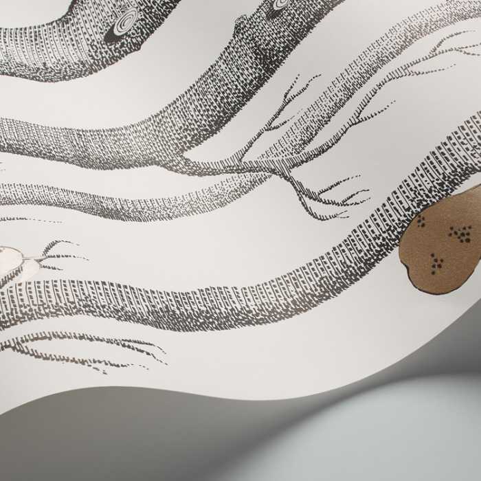 De iconische Cole &Son Woods-print heeft een groot aantal gouden peren in glinsterende metallic tinten.
