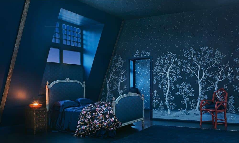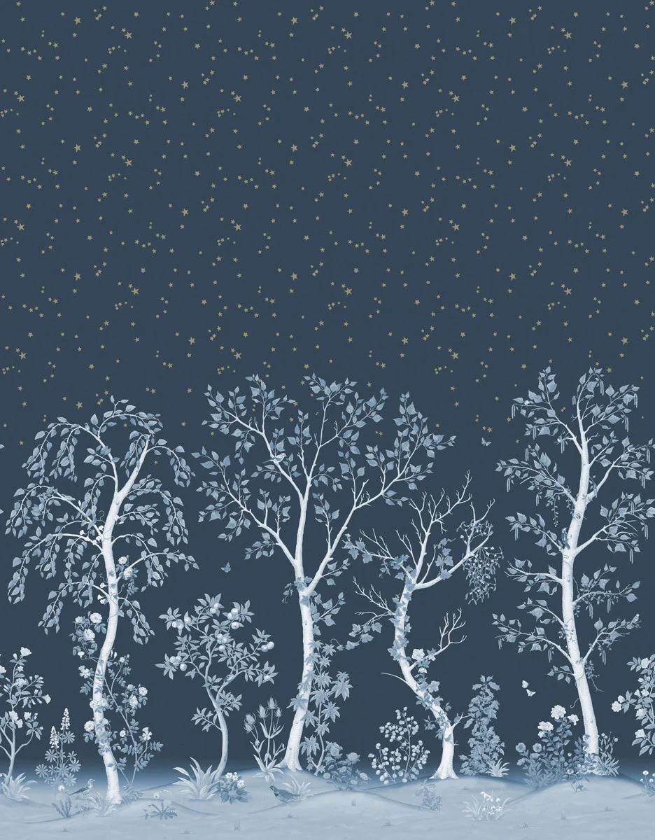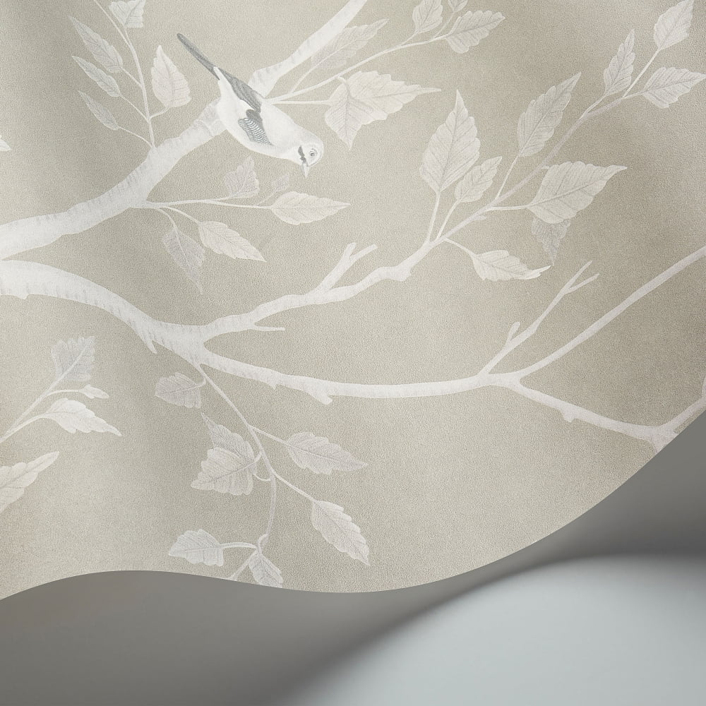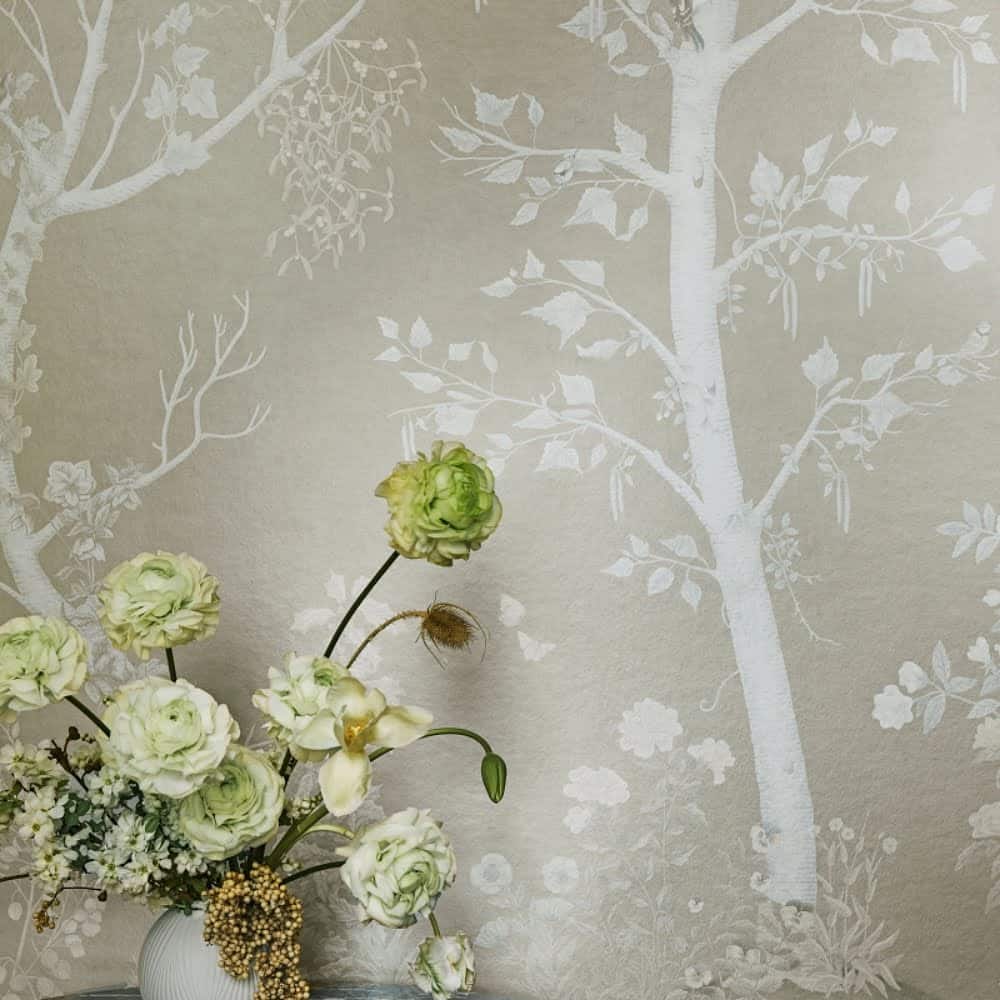 Dezelfde gracieuze bomenprint, maar dan met een verfijnde metallic glans. Het licht speelt subtiel over de stamstructuren, waardoor het behang van kleur en intensiteit lijkt te veranderen gedurende de dag.
