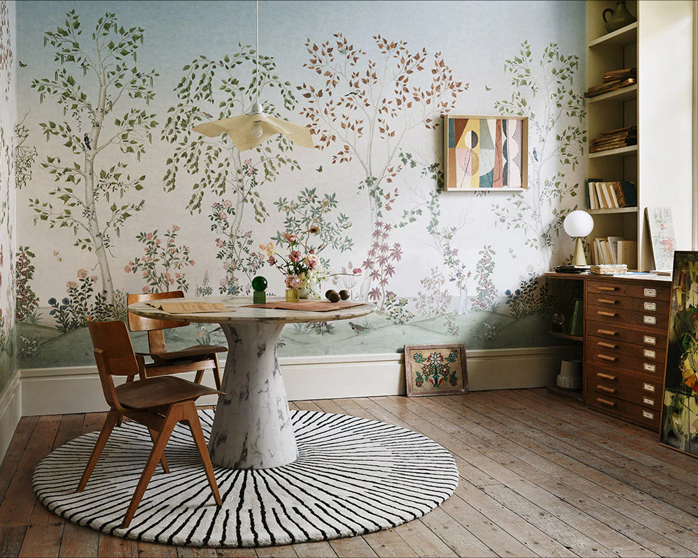 Een sfeervol patroon waarin slanke boomstammen in zachte herhaling verschijnen. Het dessin roept de sereniteit van een kalm bos op, met een ritmische structuur die diepte en rust brengt in elke ruimte.
