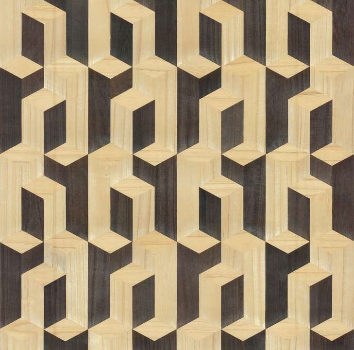 Een combinatie van liggende vlakken en opstaande balken in een contrasterende kleur. Marqueterie ten top, als wolkenkrabbers die tegen de lucht afsteken. Het dieptegevoel bij dit patroon is immens. Een eyecatcher van formaat.