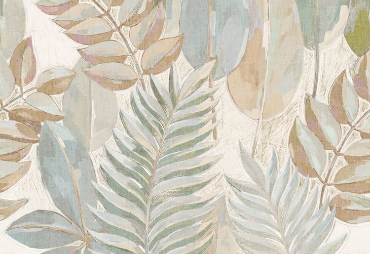 Dit patroon betovert je met zijn grote, tropische bladeren in een harmonieus palet van beige, zachtblauw, gedempt groen en lichtbruin. De beige basis geeft een gevoel van tijdloze elegantie en rust, terwijl het zachtblauw een verfrissende bries van kalmte inblaast. Het gedempte groen en lichtbruin voegen de diepte en warmte van de natuur toe aan je ruimte.
