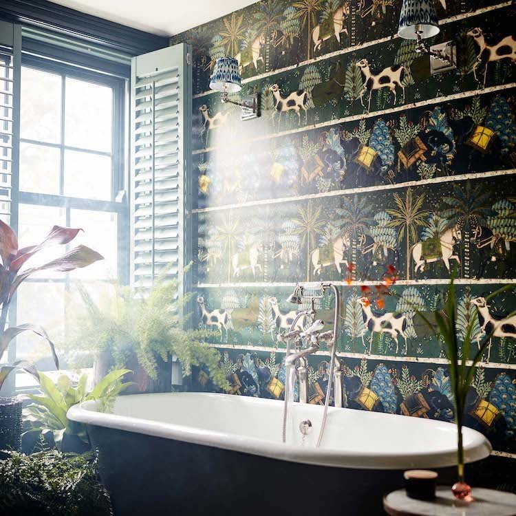 Het Woodstock Carnaval behang van Mind the Gap geeft een patroon weer van exotische bladeren, palmen, sierlijke guirlandes, olifanten en paarden. In combinatie met de meest mooie, diepe en levendige kleurencombinaties ontstaat dit magische design.