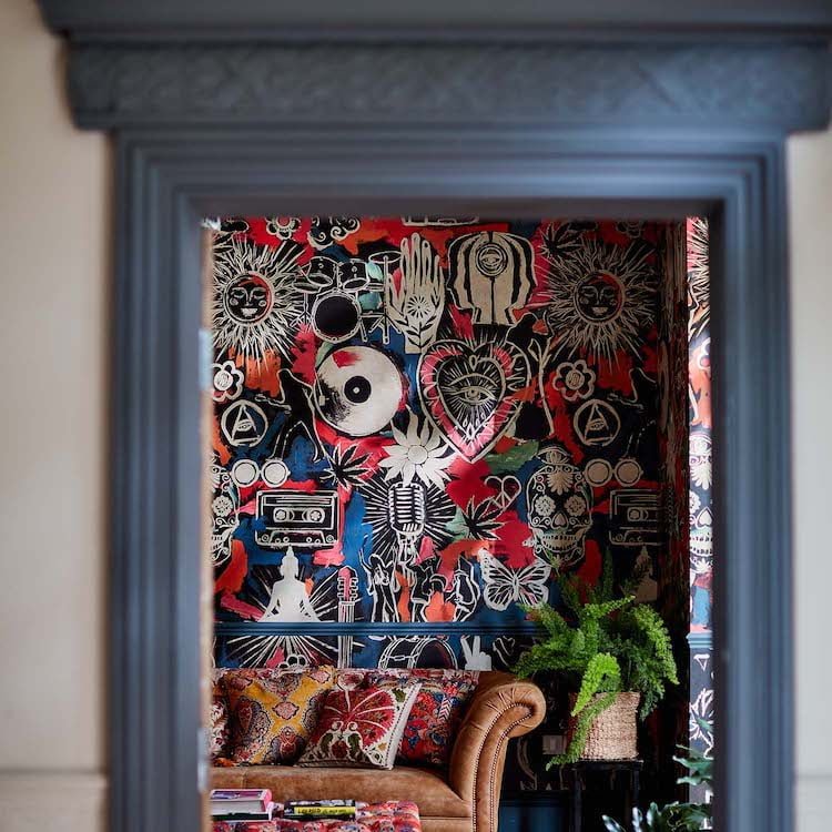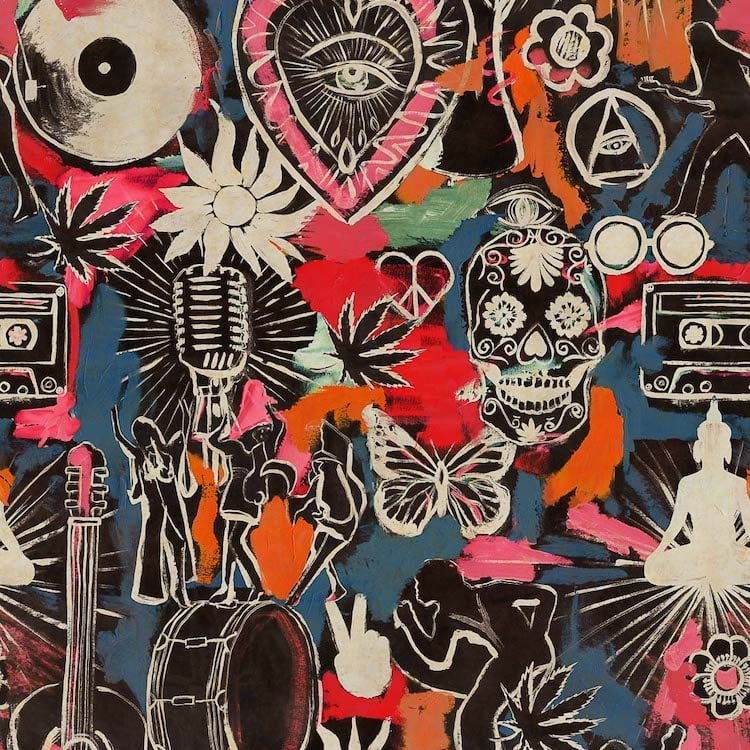 Het Woodstock Festival Memories Dark behang van Mind The Gap is ontworpen voor festival liefhebbers, die één willen zijn met de muziek, elkaar en de wereld. Je oog wordt getrokken naar de ingewikkelde details van dit behang, ontworpen met zowel lichte als donkere achtergronden en die je als het ware lijken aan te moedigen om de hele dag en nacht te feesten.