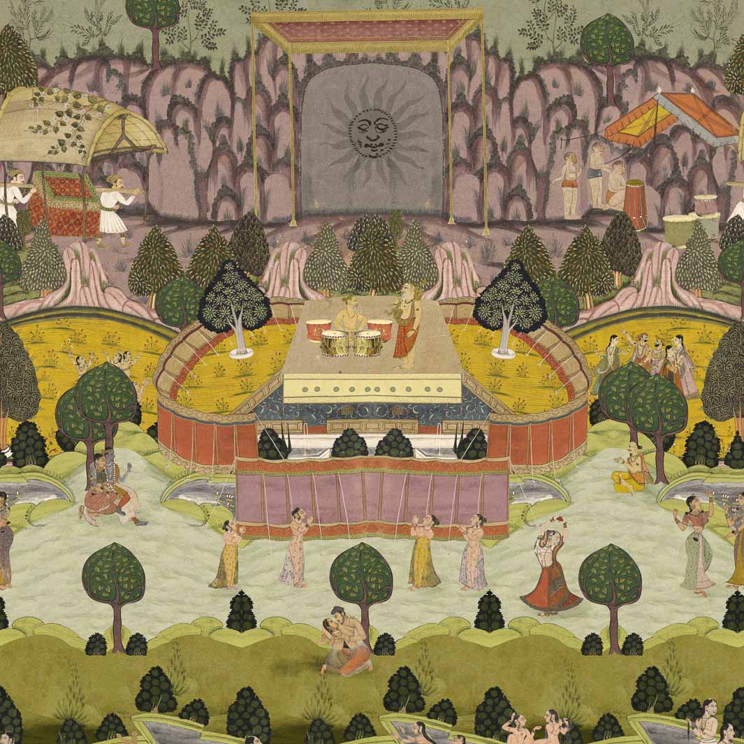 Het Woodstock Peace And Music behang van Mind The Gap is een eerbetoon aan de sfeer van liefde, vrede en muziek die te vinden was tijdens het festival. Het beeld doet denken aan Oosterse taferelen uit de 18e eeuw waar geliefden elkaar omarmen en dansen in harmonie op een open plek buiten de paleismuren. De muziek fungeert als universele taal die iedereen samenbrengt. Een spirituele omgeving vol geluk, eenheid, energie en verbondenheid.