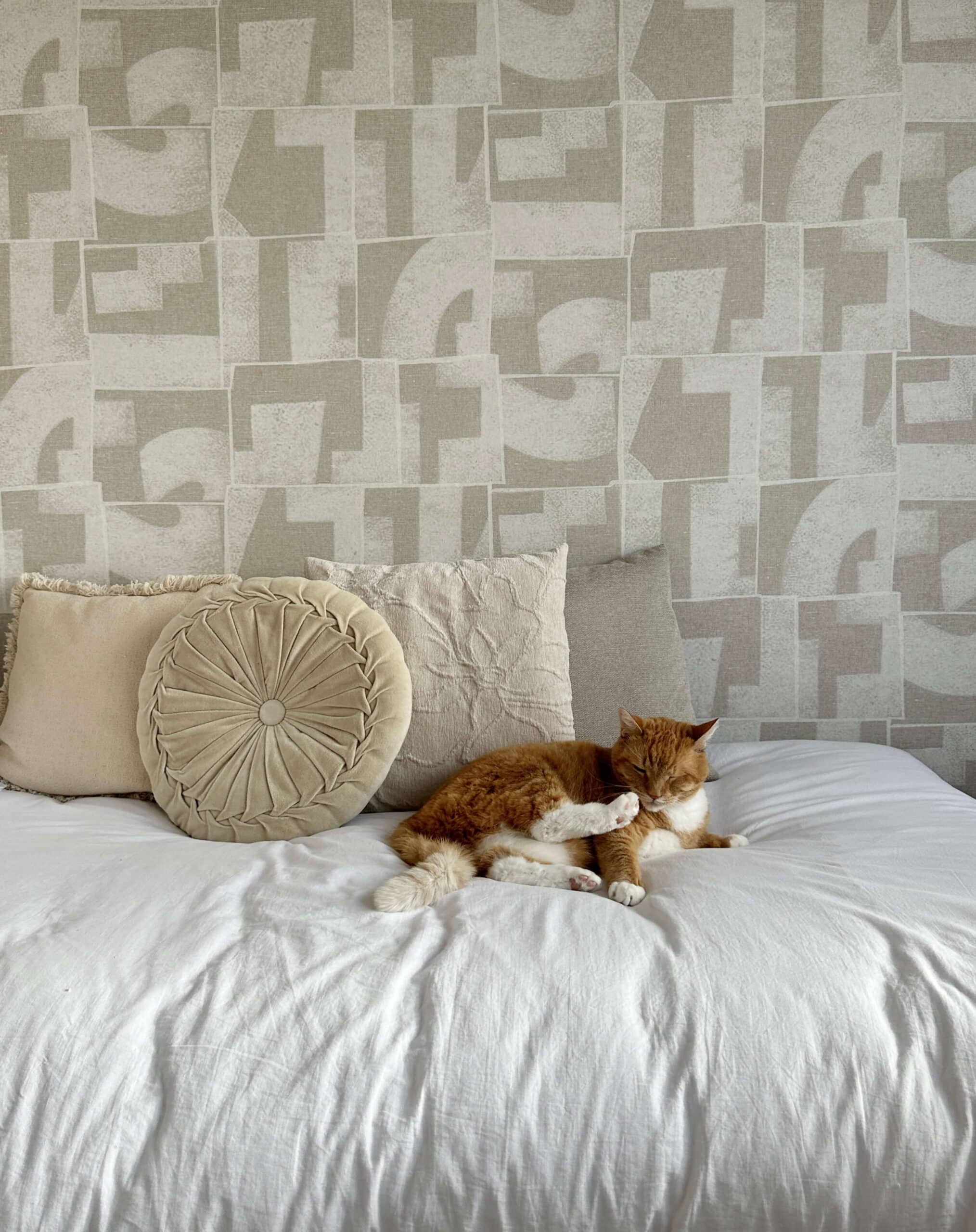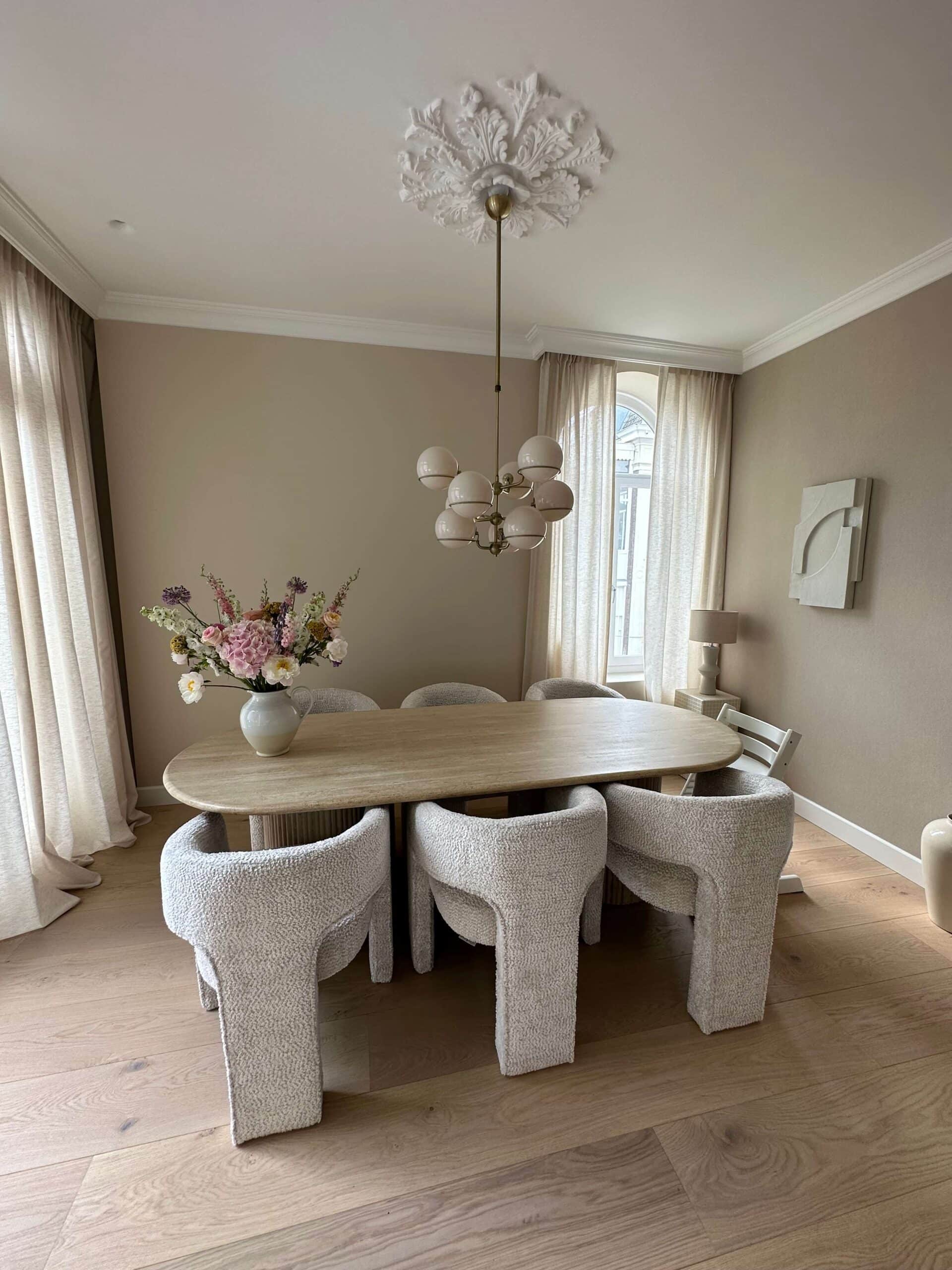 De woning van Kae mogen inrichten is een droom die uitkomt. Wanneer je aan Kae Sutherland denkt, denk je aan een beige walhalla! Maar ondanks dat we hebben gekozen voor een neutrale Japandi stijl, zijn we gaan werken met verschillende beige- en bruintinten, om het interieur wel een warme uitstraling mee te geven. Met de kleuren Latte voor de muren en Perfect White, beide van Zoffany, voor het houtwerk, creëerden we een ideale basis. De vloer, die rustiek wit geolied is, matcht er perfect bij. Het prachtige Flamant behang met een rustige linnenstructuur van Arte en de 100% linnen gordijnen vormen in combinatie met sierlijsten en prachtige klassieke ornamenten een chic, modern en sfeervol geheel.