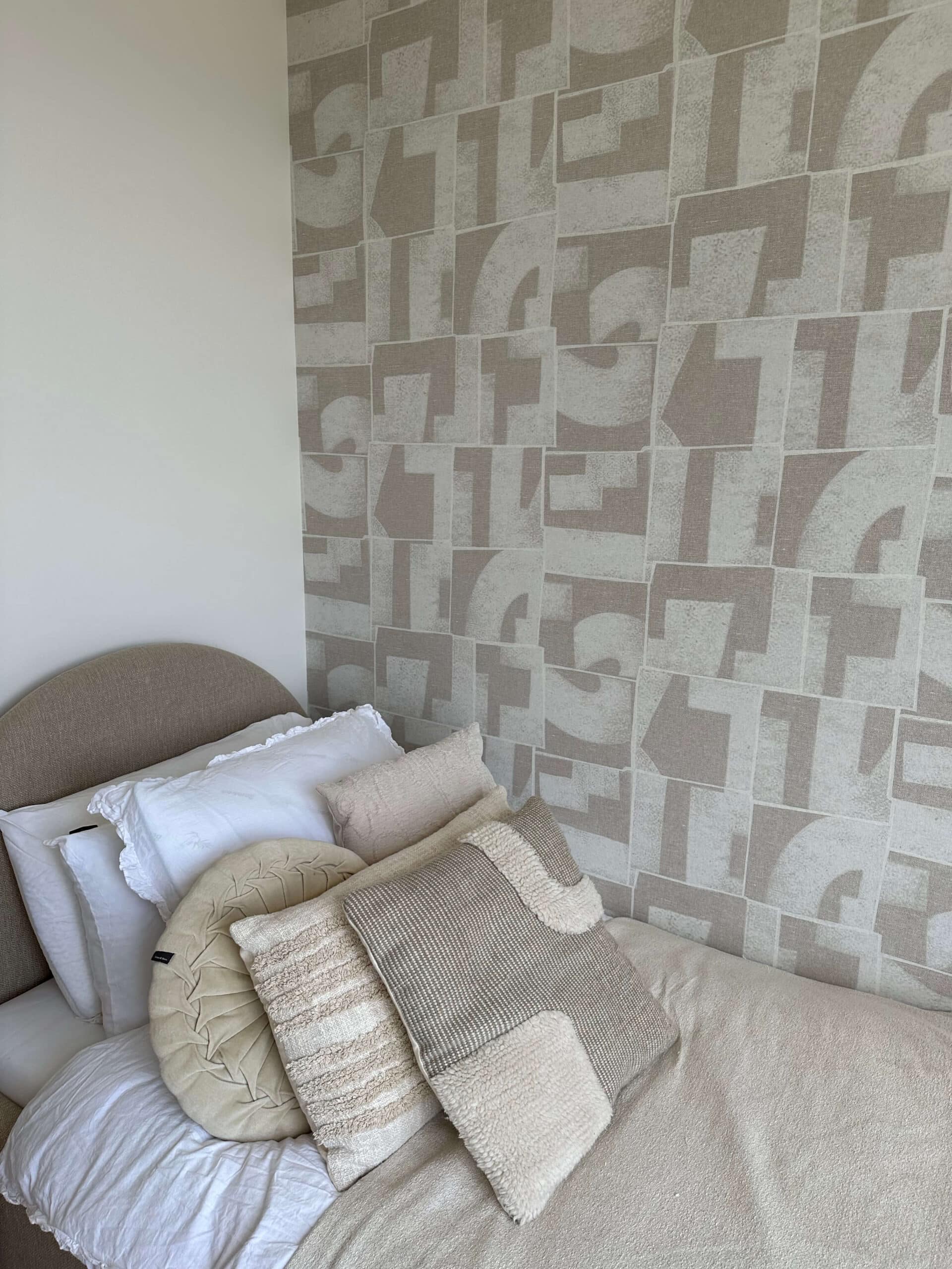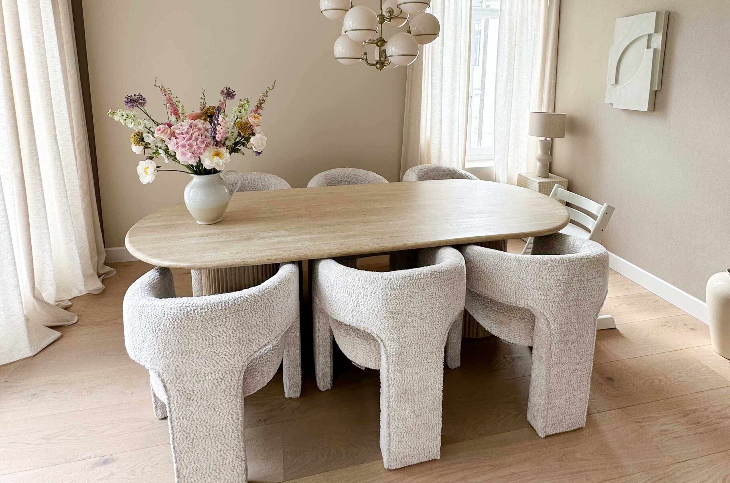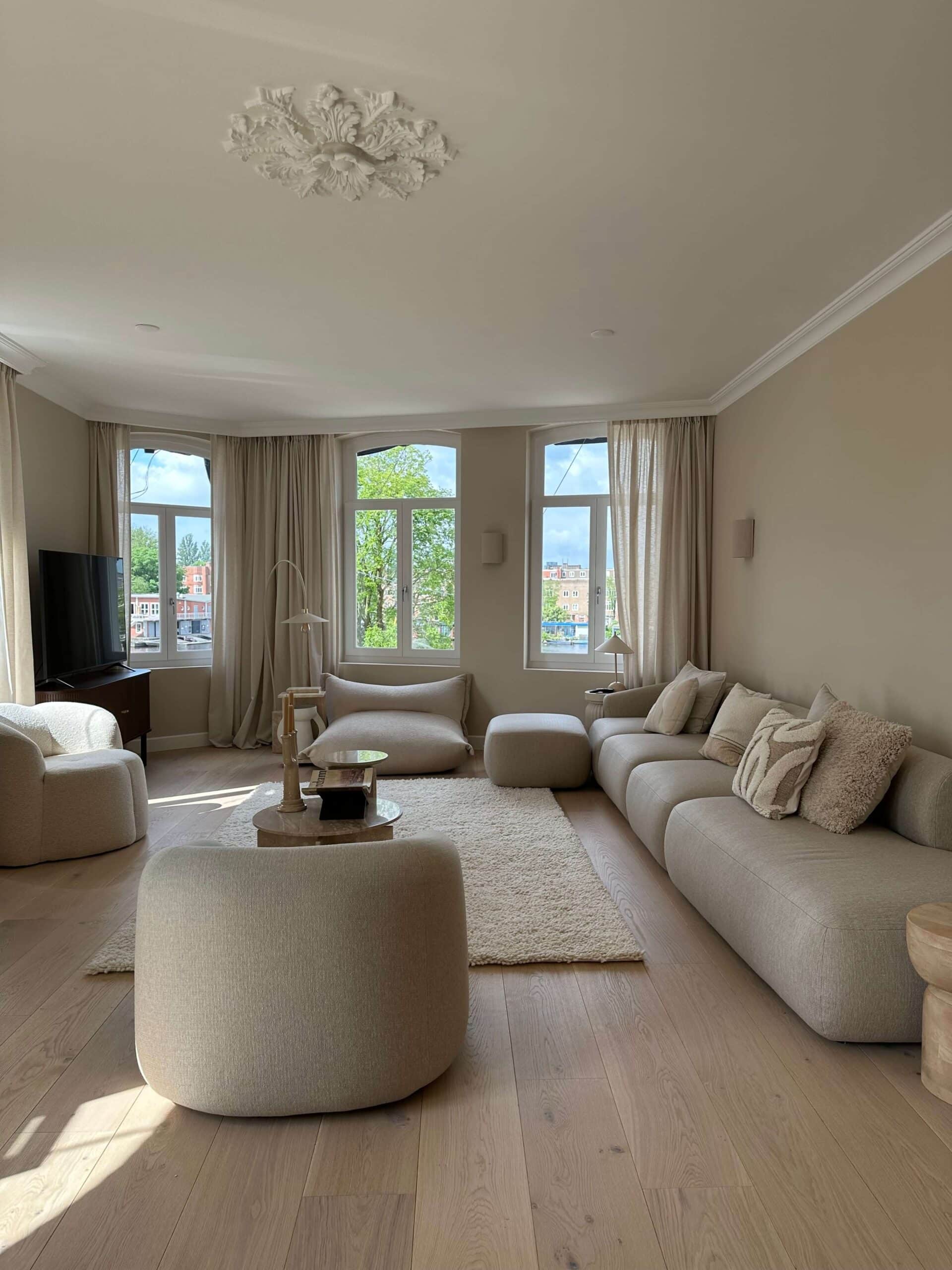 De woning van Kae mogen inrichten is een droom die uitkomt. Wanneer je aan Kae Sutherland denkt, denk je aan een beige walhalla! Maar ondanks dat we hebben gekozen voor een neutrale Japandi stijl, zijn we gaan werken met verschillende beige- en bruintinten, om het interieur wel een warme uitstraling mee te geven. Met de kleuren Latte voor de muren en Perfect White, beide van Zoffany, voor het houtwerk, creëerden we een ideale basis. De vloer, die rustiek wit geolied is, matcht er perfect bij. Het prachtige Flamant behang met een rustige linnenstructuur van Arte en de 100% linnen gordijnen vormen in combinatie met sierlijsten en prachtige klassieke ornamenten een chic, modern en sfeervol geheel.