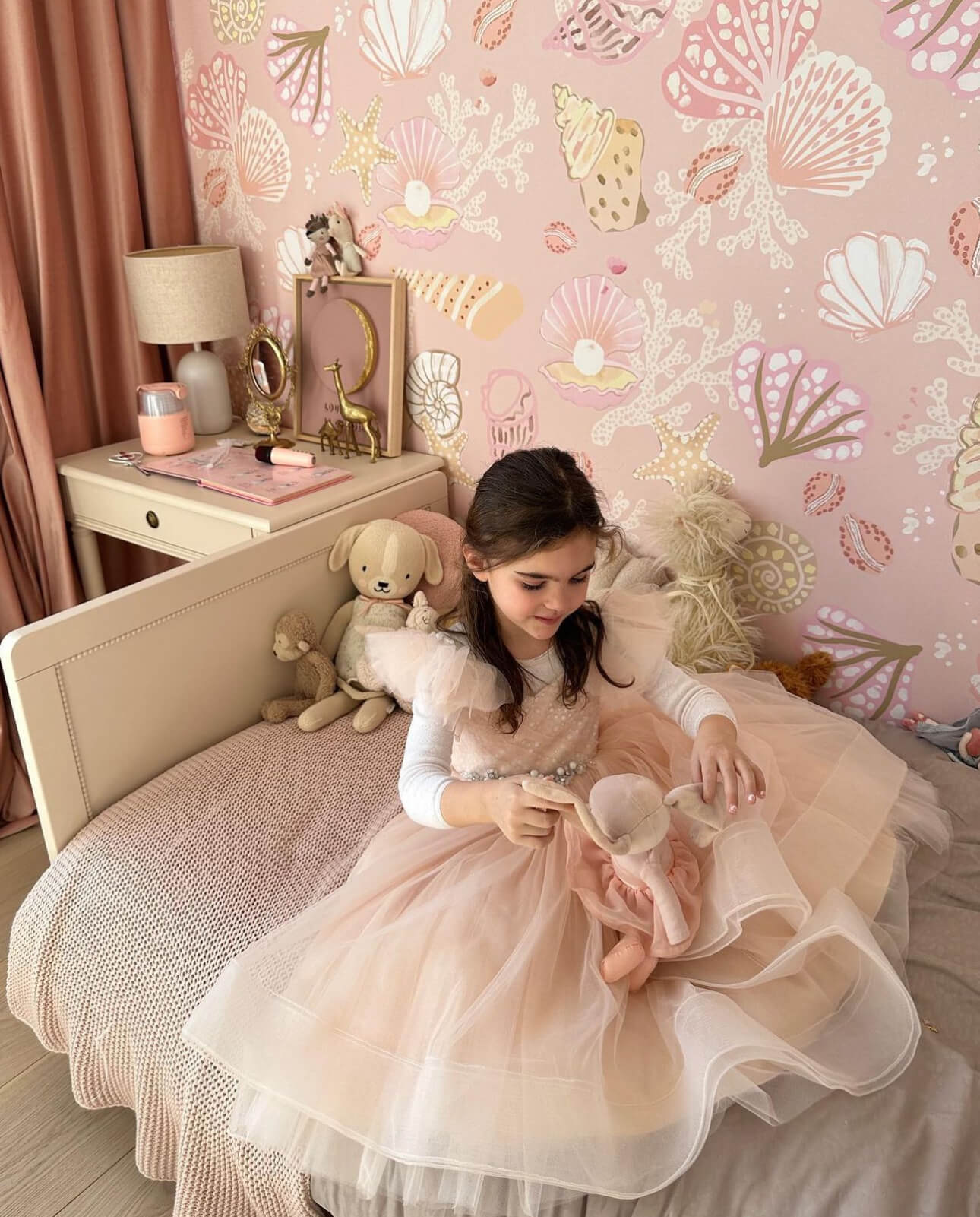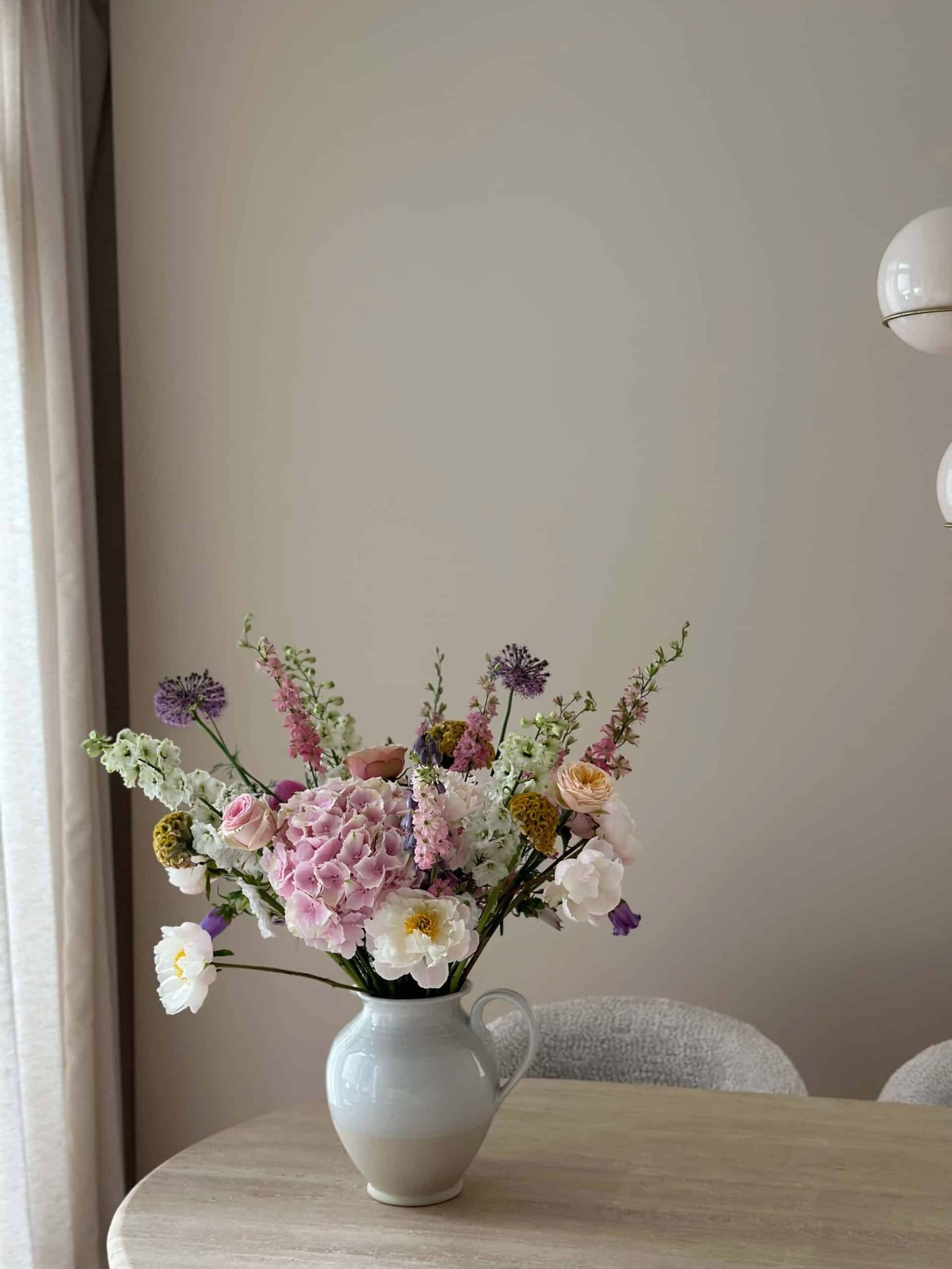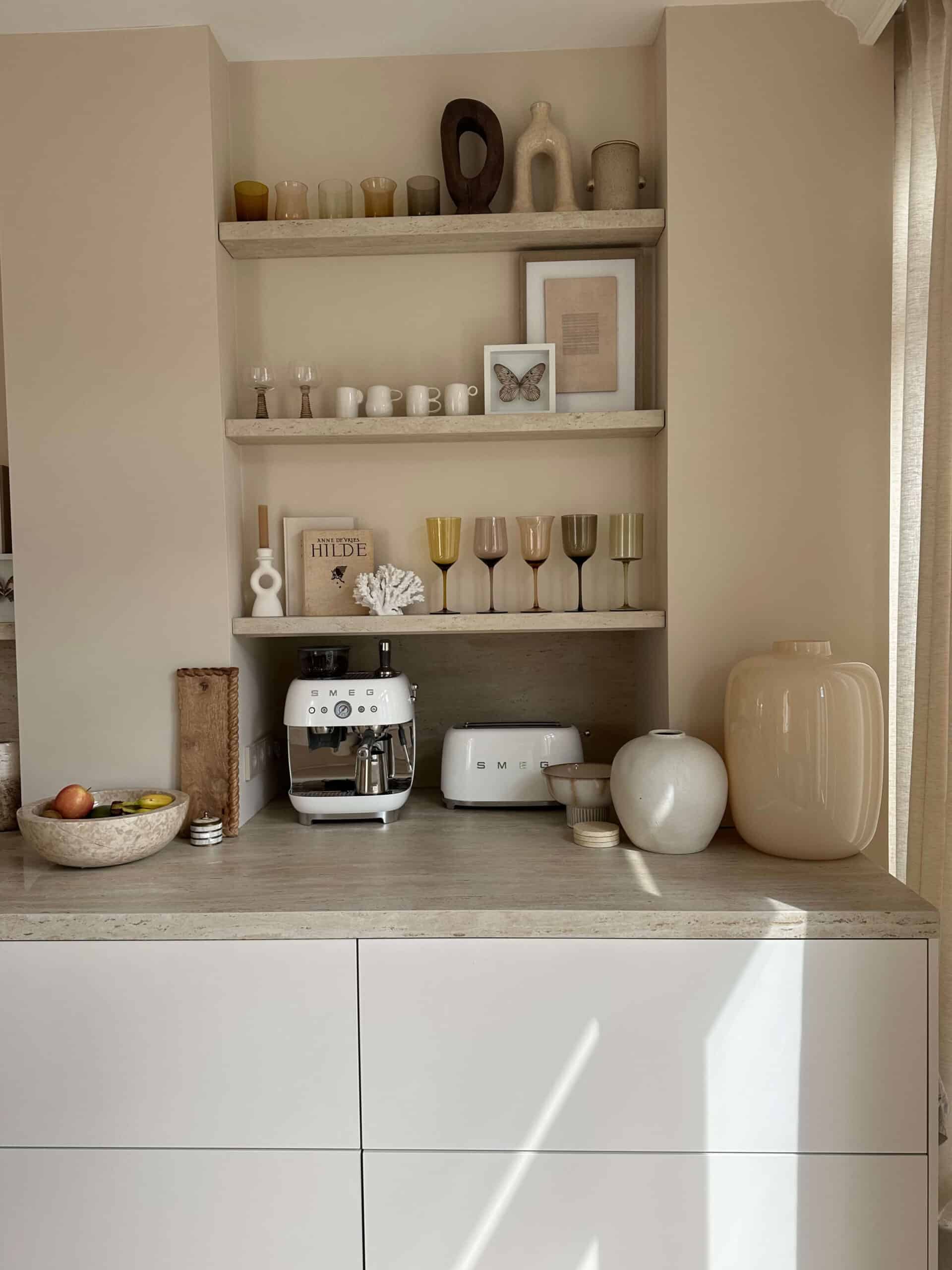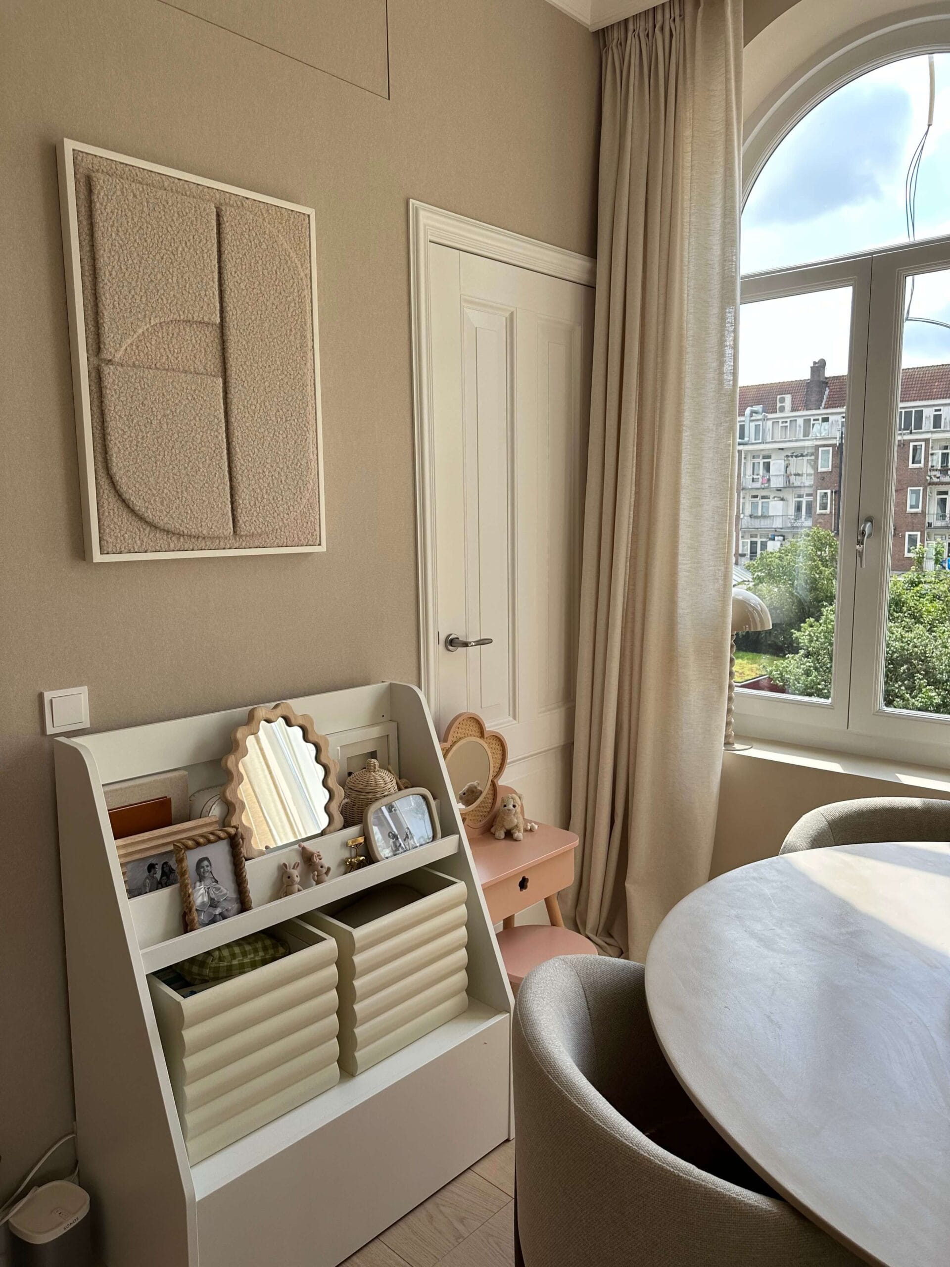 De woning van Kae mogen inrichten is een droom die uitkomt. Wanneer je aan Kae Sutherland denkt, denk je aan een beige walhalla! Maar ondanks dat we hebben gekozen voor een neutrale Japandi stijl, zijn we gaan werken met verschillende beige- en bruintinten, om het interieur wel een warme uitstraling mee te geven. Met de kleuren Latte voor de muren en Perfect White, beide van Zoffany, voor het houtwerk, creëerden we een ideale basis. De vloer, die rustiek wit geolied is, matcht er perfect bij. Het prachtige Flamant behang met een rustige linnenstructuur van Arte en de 100% linnen gordijnen vormen in combinatie met sierlijsten en prachtige klassieke ornamenten een chic, modern en sfeervol geheel.